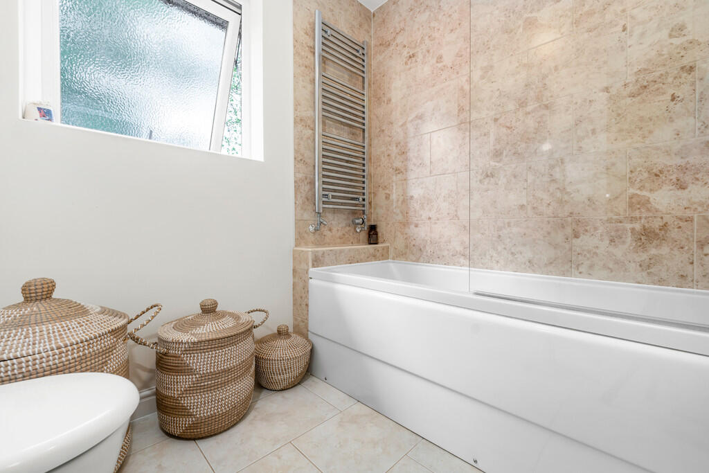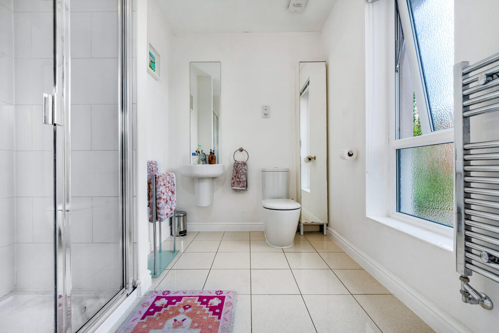 BATHROOM Double glazed obscure window to rear. White suite comprising panelled bath with chrome mixer tap and shower over, glass screen. Floating wash hand basin and low level WC. Heated towel rail. Fully tiled walls and tiled flooring.