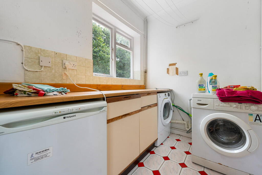 UTILITYROOM9' 0" x 6' 0" (2.75m x 1.84m) Fitted with base units with worktops over. Space for washing machine, tumble dryer and under counter fridge/freezer. Wall mounted combi boiler to external wall. Single glazed wooden window to side and door leading to rear garden.