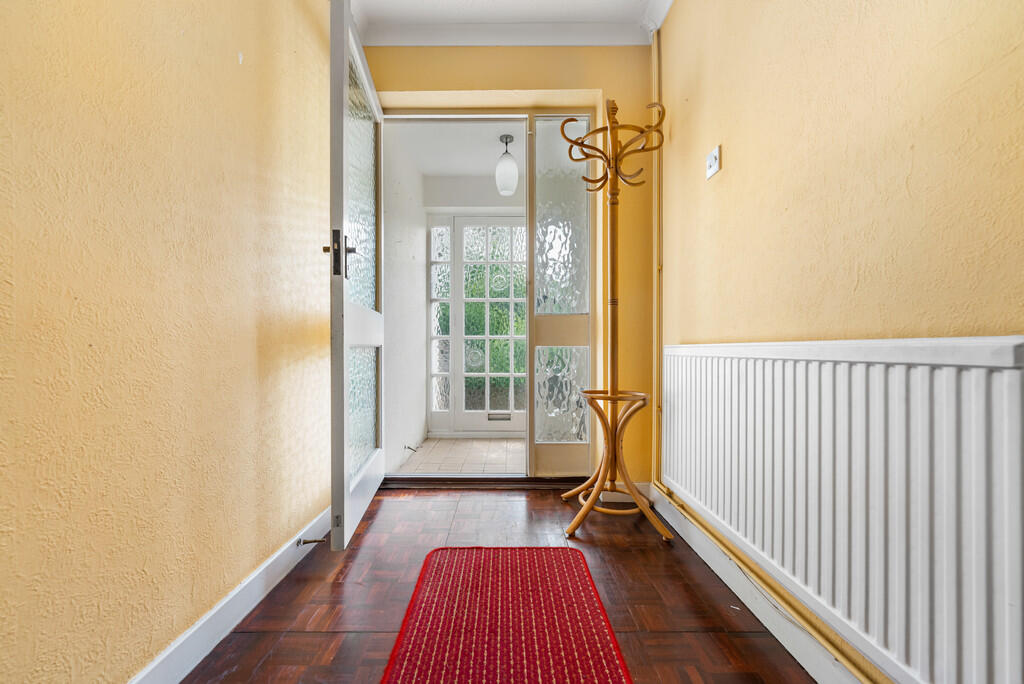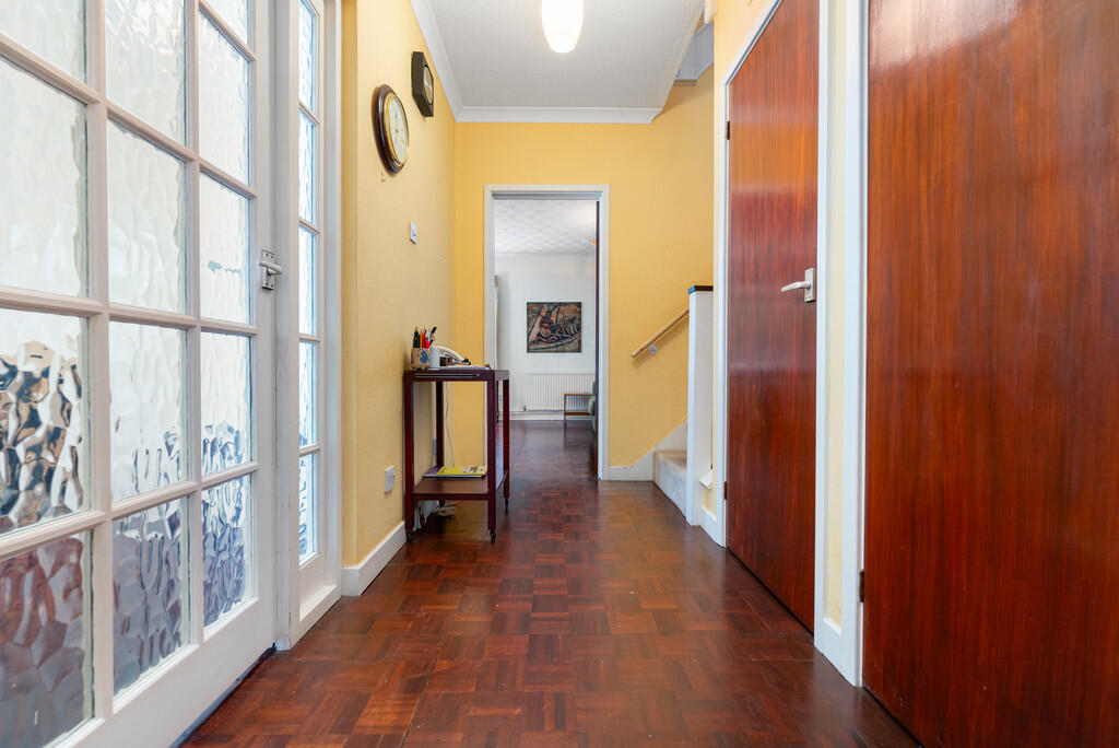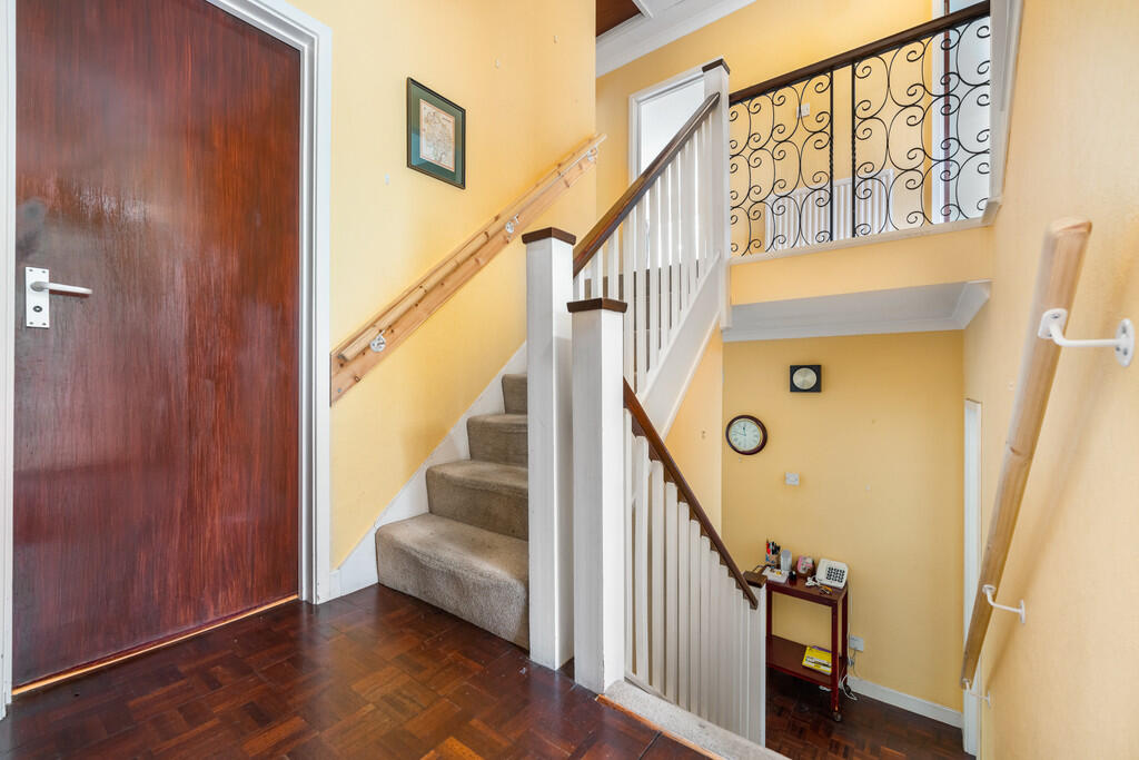 HALLWAY Textured walls and ceiling with a central light pendant and original parquet flooring to finish. Door leading to garage, cloakroom and a single storage cupboard with hanging rail. Staircase leading down to lower ground floor and first floor.