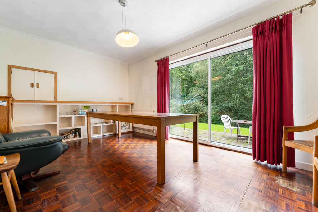 DININGROOM16' 3" x 10' 6" (4.96m x 3.21m) Built in display cabinet with serving hatch above. Smooth walls with textured ceiling with central light pendant and parquet flooring to finish. Single glazed aluminium sliding doors leading to garden.