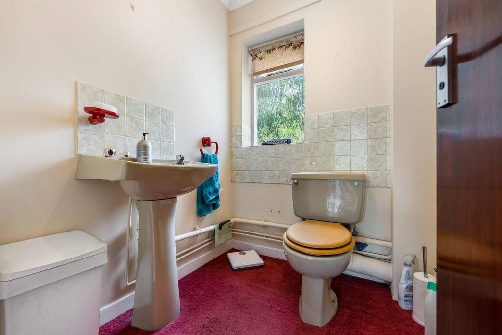 CLOAKROOM Fitted with a two piece suite comparing WC and wash hand basin. Tiled splash back with smooth walls, textured ceiling, a central light pendant and carpeted flooring to finish. Single glazed obscure window to rear.