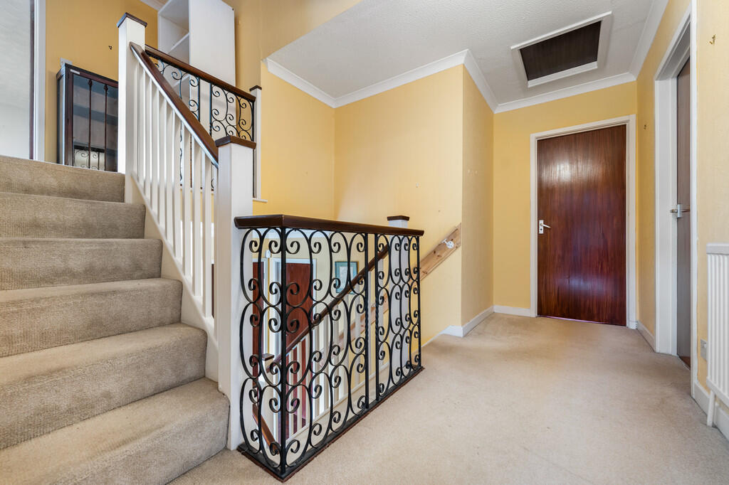 FIRSTFLOORLANDING Textured walls and ceiling with a central light pendant and carpeted flooring to finish. Loft hatch providing access to loft storage.
