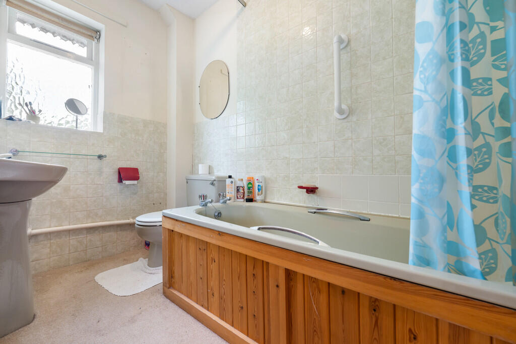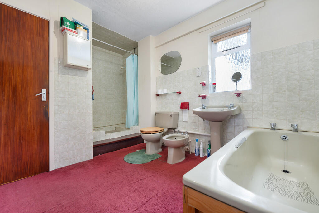 BATHROOM Fitted with a traditional five piece bathroom suite comprising free standing bath, walk in shower, WC, bidet and wash hand basin. Tiled walls with textured ceiling with a central light pendant and carpeted flooring to finish. Single glazed wooden obscure window to side. Door leading into alcove storage.