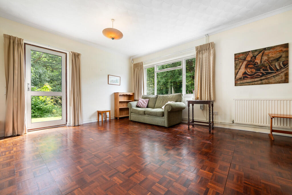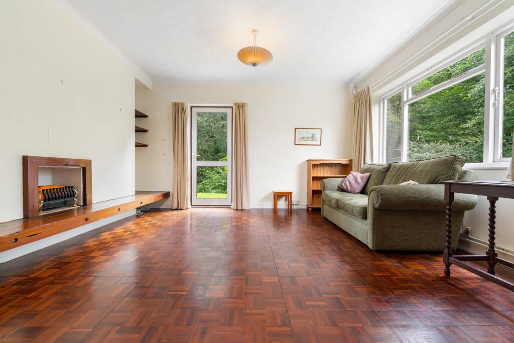 LOUNGE19' 10" x 14' 9" (6.07m x 4.52m) Smooth walls with textured ceiling and two central light pendants with original parquet flooring to finish. Built in display shelving with feature fire place. Single glazed aluminium door leading to rear garden and single glazed wooden window to side.