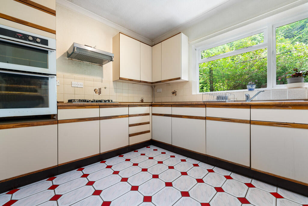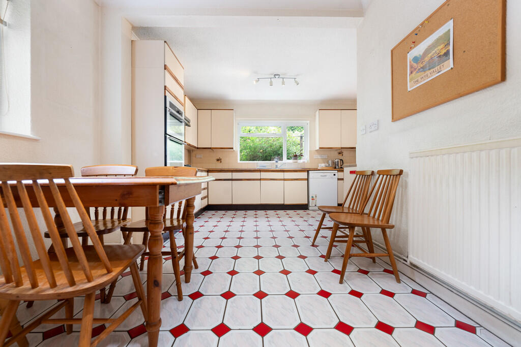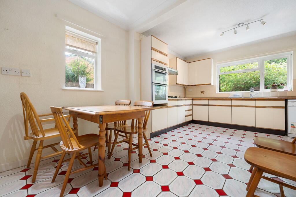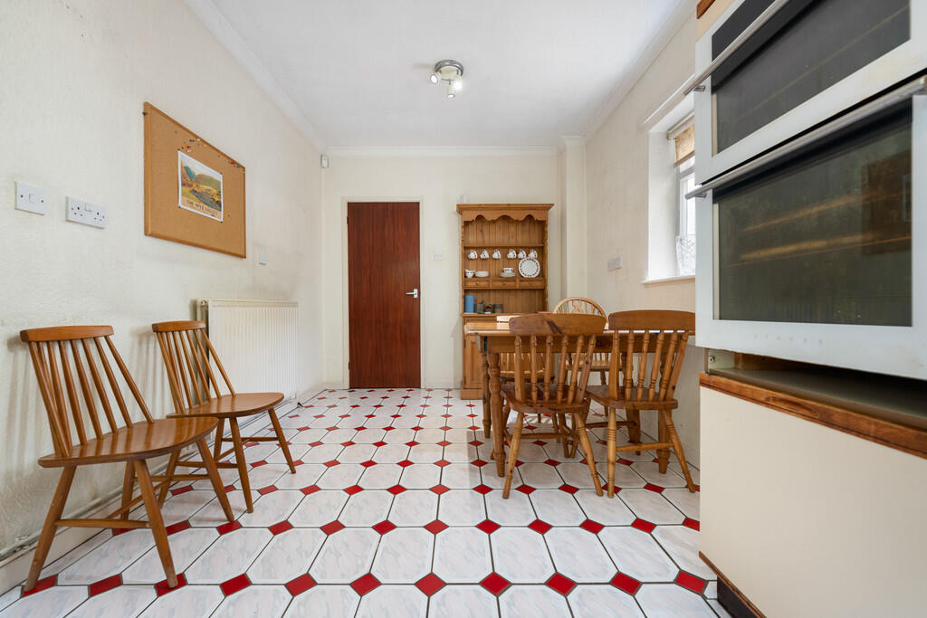 KITCHEN13' 3" maximum x 18' 5" (4.04m x 5.63m) Fitted with a range of base and eye level units with worktops over. Built in double oven, gas hob and cooker hood over. Inset stainless steel one and a half bowl sink unit plus drainer. Space for dishwasher, and under counter fridge/freezer. Space for table and chairs. Tiled splash back with tiled flooring and textured walls and ceiling. Single glazed wooden window to side and rear. Door leading to utility room.