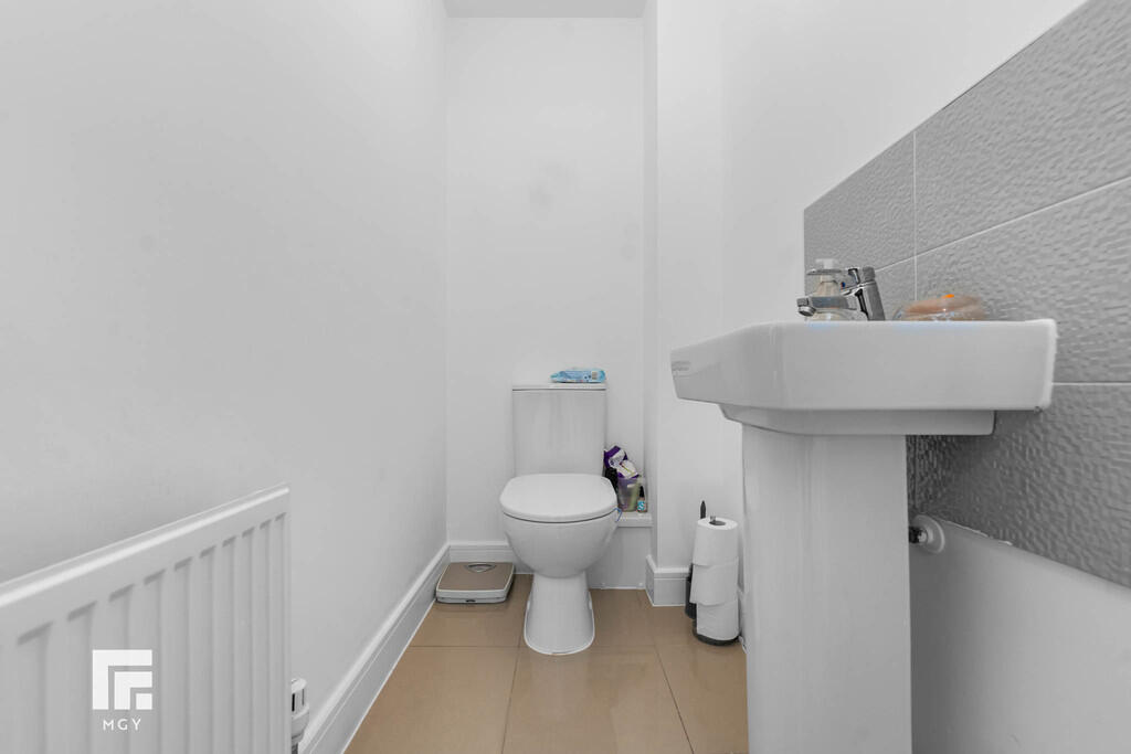 DOWNSTAIRSWC6' 0" x 3' 4" (1.85m x 1.04m) Tiled flooring. Pendant light fitting. WC. Pedestal wash hand basin with mixer tap over. Tiled splashback. Radiator. Extractor fan.