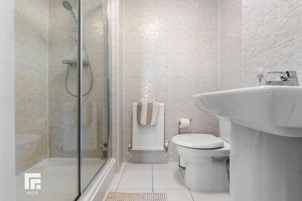 ENSUITE6' 11" x 4' 7" (2.11m x 1.42m) Tiled walls and flooring. Spotlights. Walk in shower cubicle with mains powered shower. Pedestal wash hand basin with mixer tap over. WC. Shaver point. Radiator.