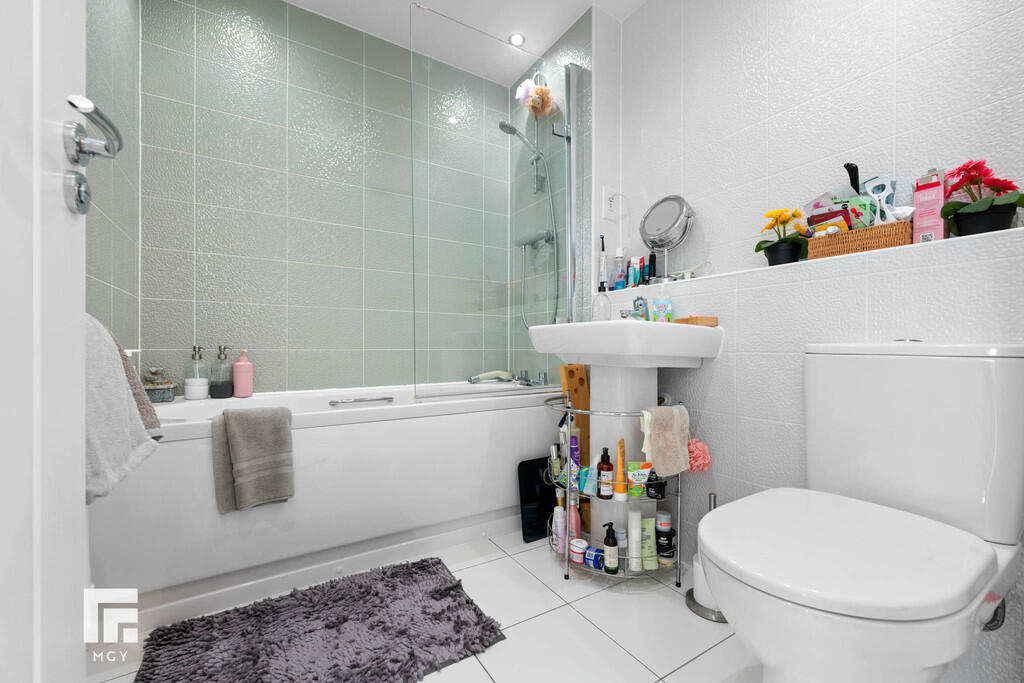 BATHROOM7' 3" x 6' 0" (2.21m x 1.85m) Tiled flooring and walls. Spotlights. White three-piece-suite comprising WC, pedestal wash hand basin with mixer tap over, panelled bath with tap over and mains powered shower above. Glass shower screen. Shaver point. Radiator.