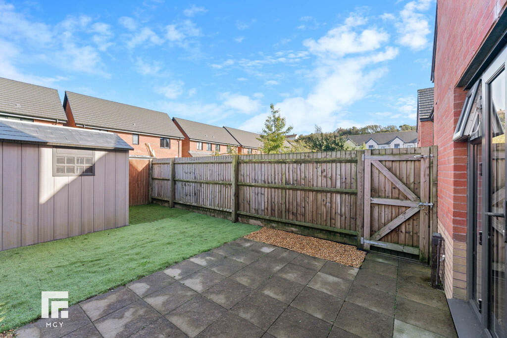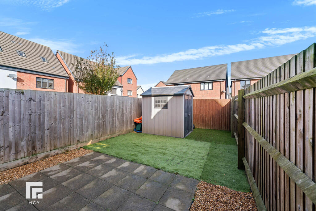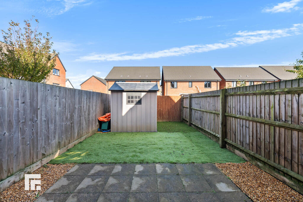 Rear - Laid to patio. Artificial grass. Fence border. Space for shed.