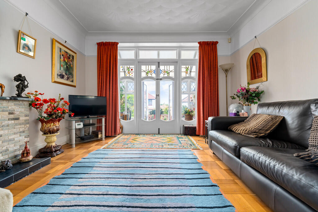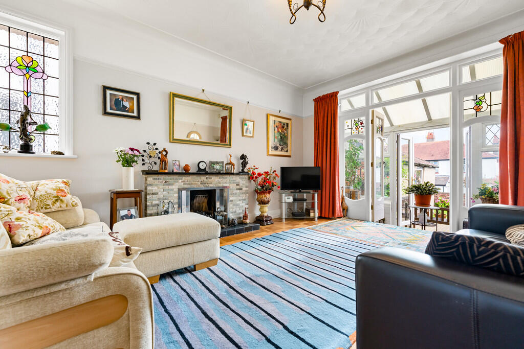 LOUNGE15' 1" x 11' 11" (4.60m x 3.65m) Textured walls and ceiling with a central light pendant and parquet flooring to finish. Featured fireplace and surround original stained glass window to side and original double doors leading to conservatory with stained glass toppers.