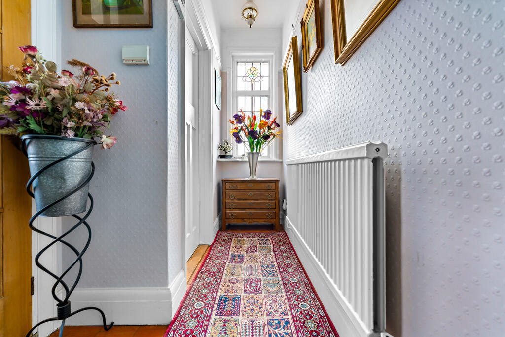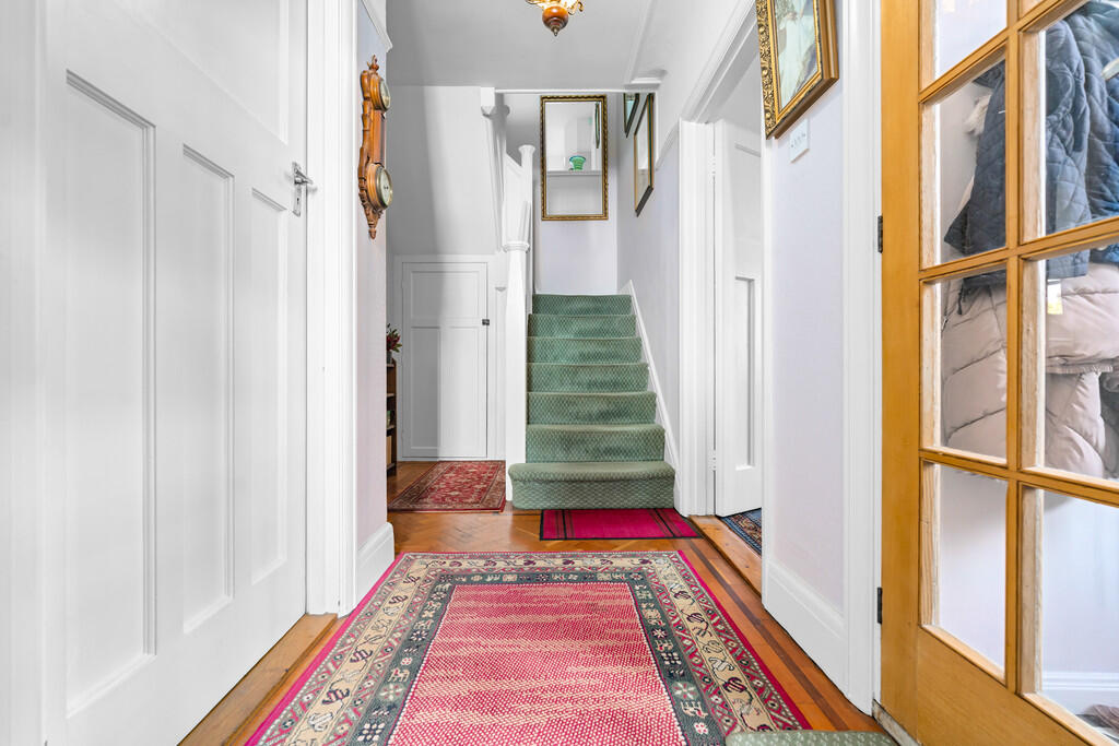 HALLWAY Textured walls with smooth ceiling and a central light pendant and parquet flooring. Doors leading into all ground floor rooms. Carpeted staircase leading to first floor with large under stair storage cupboard complete with lighting. Original stained glass window to side.
