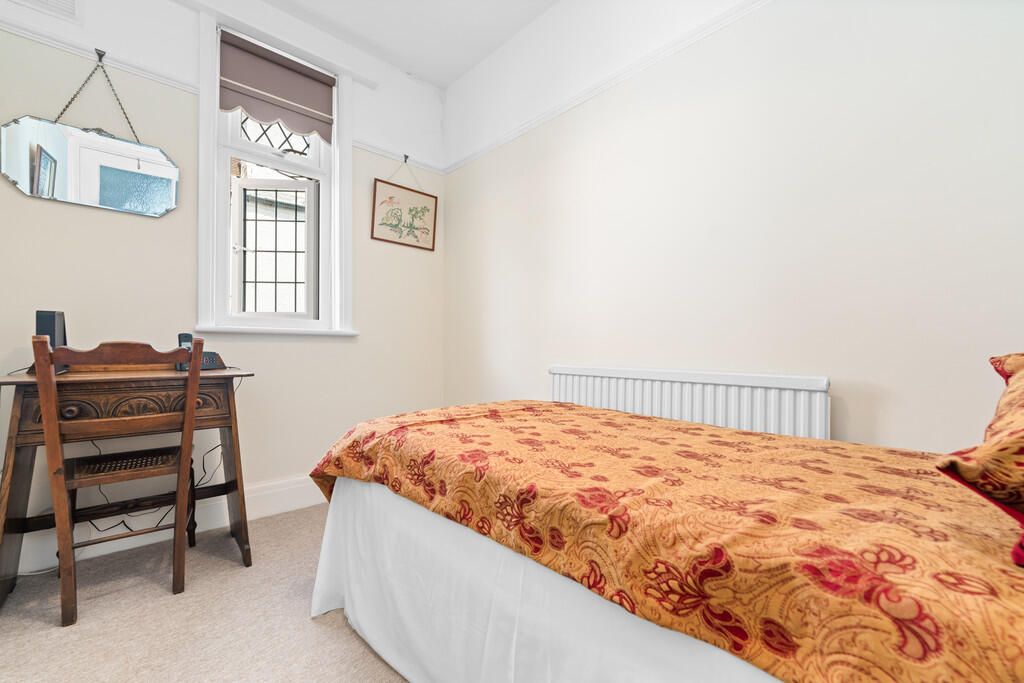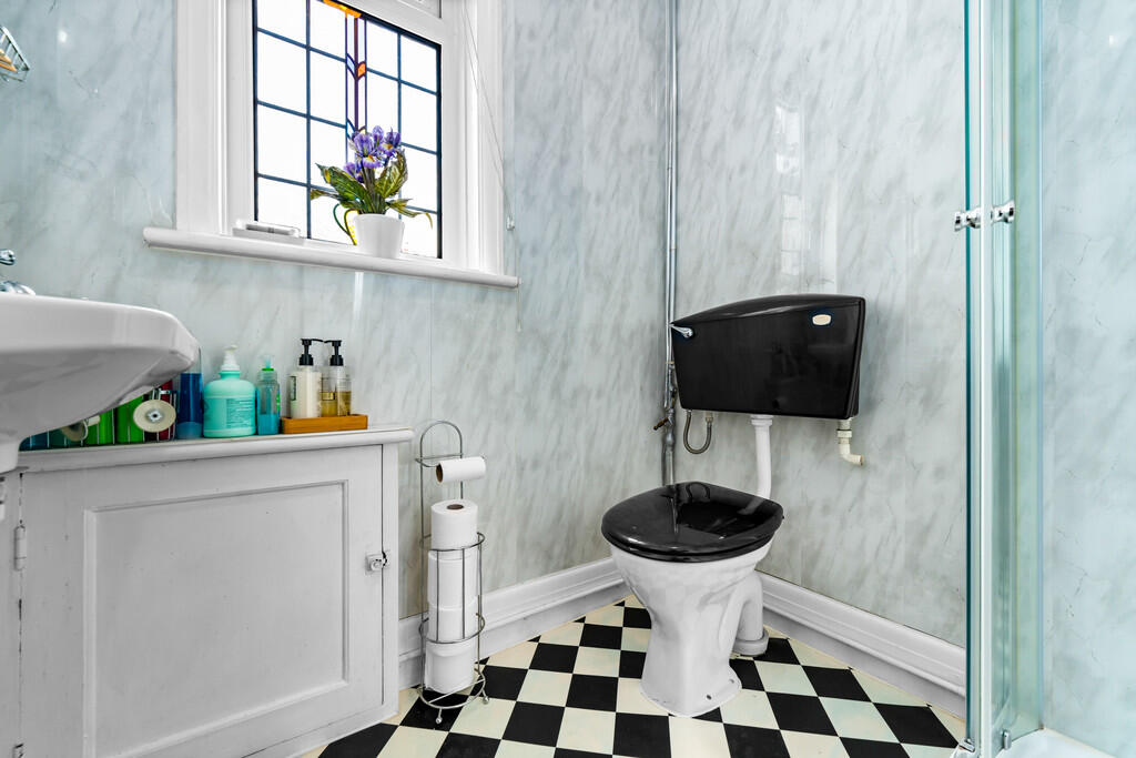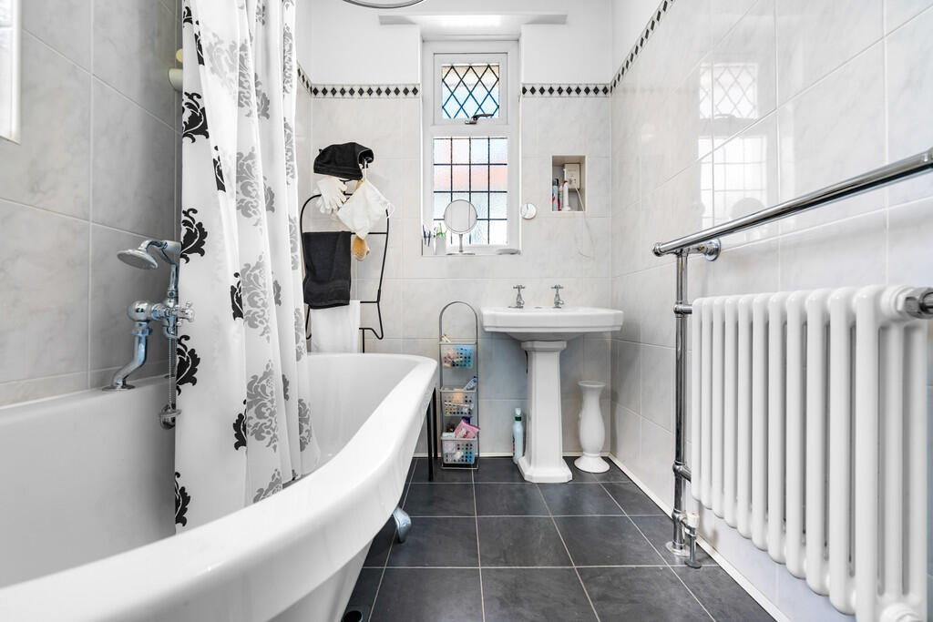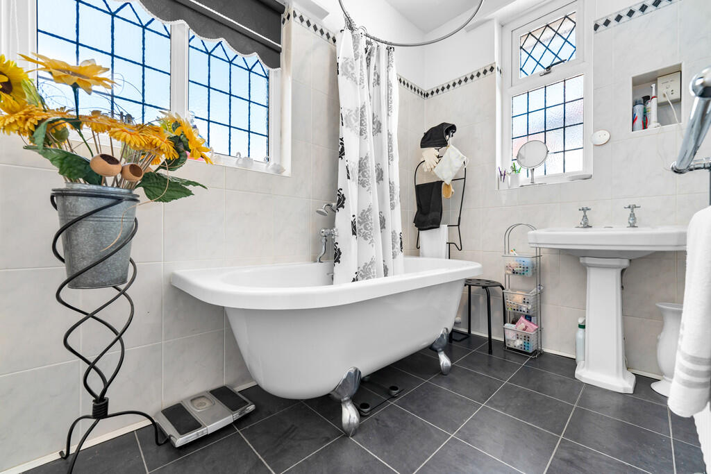 BATHROOM Fitted with a traditional two piece bathroom suite comprising free standing roll top bath and wash hand basin. Tiled walls with tiled floor and textured ceiling to finish. Heated towel rail, central light pendant and shaving point. Built in double storage housing Worceter Combi boiler (installed in 2020) plus ample shelving for storage. Upvc double glazed obscure window to side.