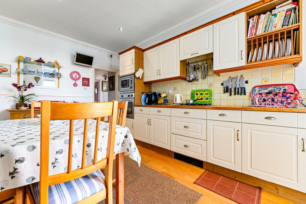 KITCHEN9' 3" x 14' 9" maximum (2.84m x 4.52m) Fitted with a range of shaker style base and eye level units with solid pine worktops over. Built in electric oven and microwave, gas hob and cooker hood over. Inset stainless steel unit plus drainer. Kick board heating also installed. Tiled splash back with smooth walls and ceiling complete with spot lighting and laminate flooring to finish. Space for dining table and chairs. Door leading to pantry and Upvc double glazed door leading to rear. Upvc double glazed window to rear.