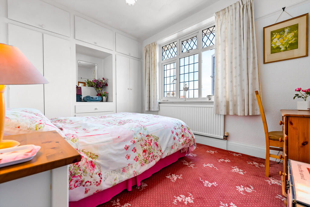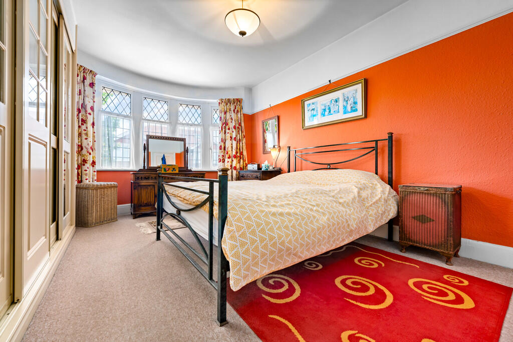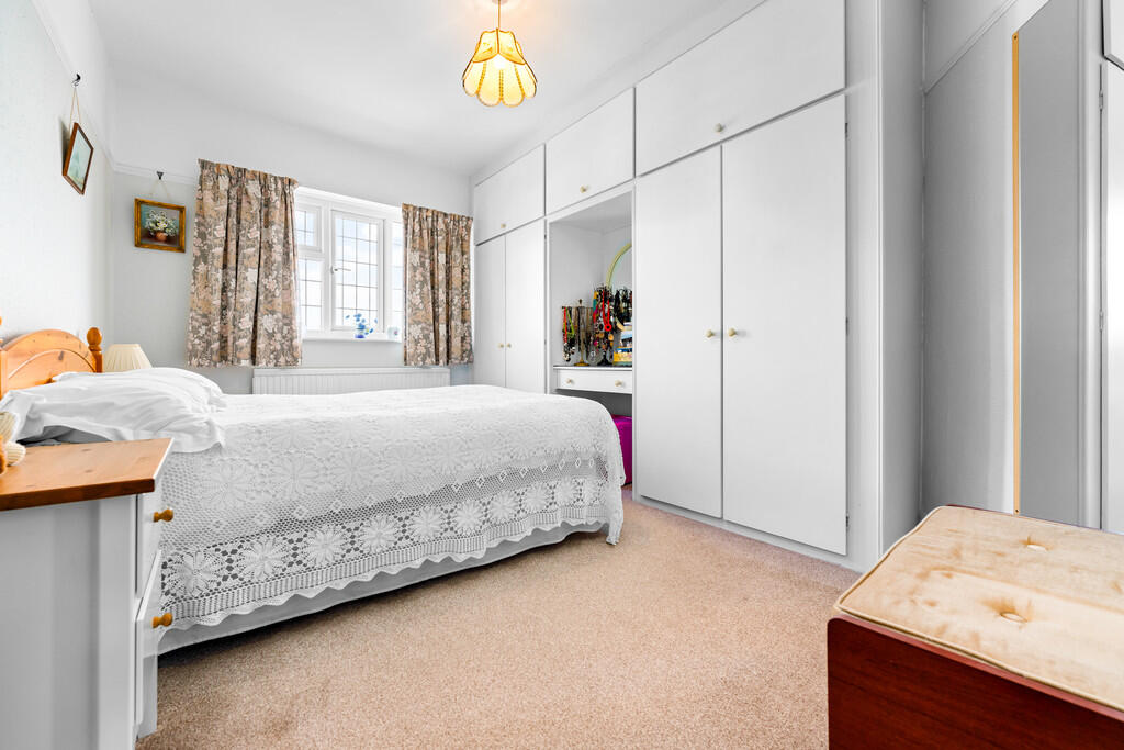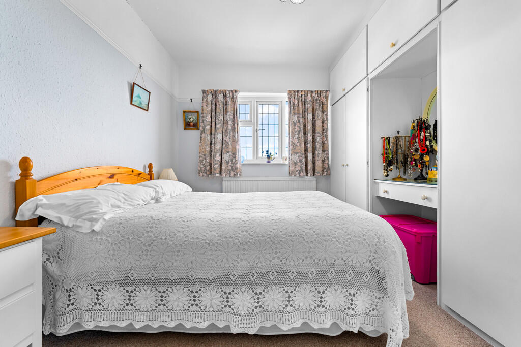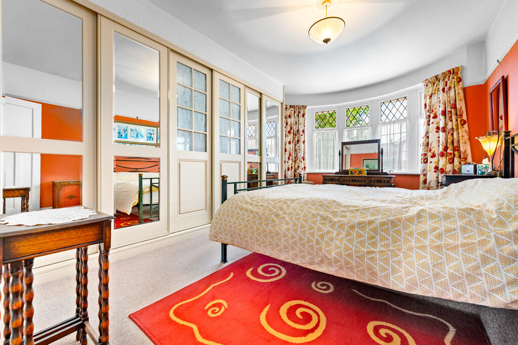 BEDROOMONE16' 1" into bay x 11' 3" (4.92m x 3.43m) Textured walls with smooth ceiling and a central light pendant. Carpeted flooring to finish. Built in sliding mirrored and bevelled wardrobes with hanging rails, drawers and shoe storage. Upvc double glazed bay window to front.