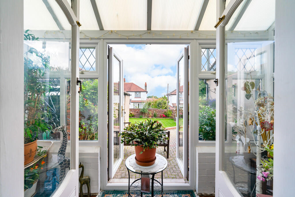SUNROOM7' 4" x 11' 4" (2.25m x 3.46m) Upvc double glazed windows to rear and side with Upvc double glazed French doors leading into the rear garden. Original tiled flooring with corrugated clear roof.
