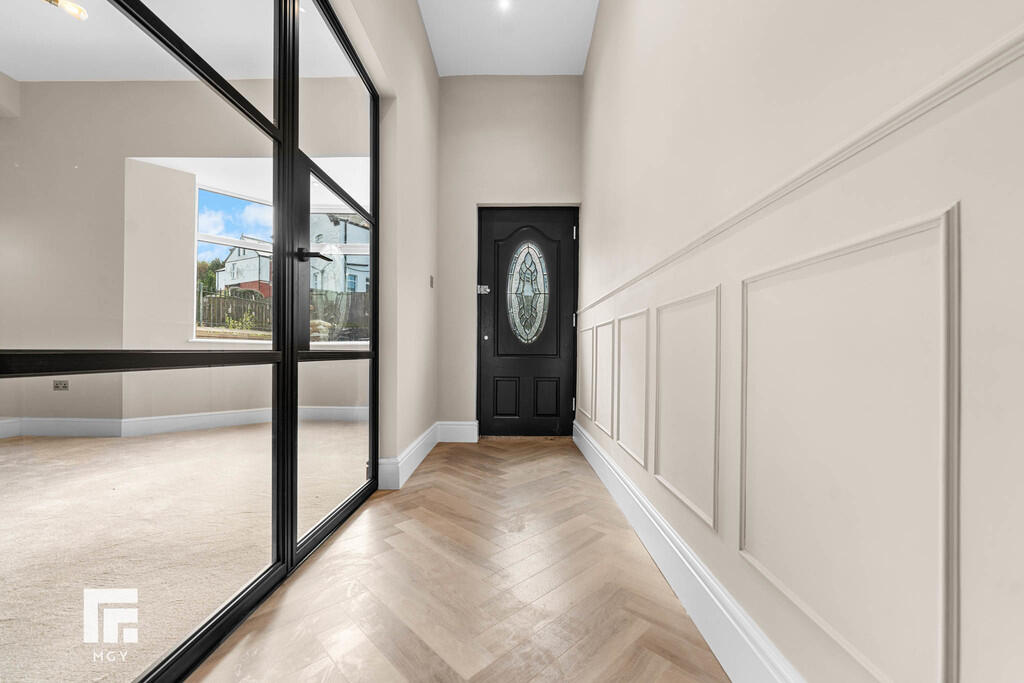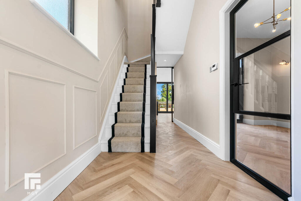 ENTRANCEHALL Entered front door leading from private front garden. Newly fitted LVT flooring. Feature wall panelling. Pendant light fittings. Doors to lounge, dining room, downstairs WC, and kitchen. Underfloor heating. Stairs rising to first floor.