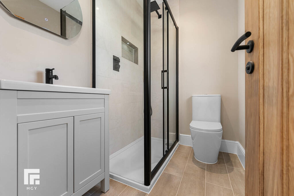 ENSUITE Tiled flooring. Vanity wash hand basin with mixer tap over and storage beneath. Walk in shower cubicle with mains powered drench shower over and additional handheld attachment. WC. Extractor fan. Obscure double glazed window. Spotlights.
