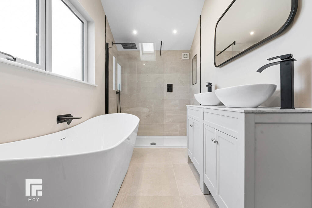 FAMILYBATHROOM Tiled flooring. Spotlights. Free standing curved bath with mixer tap over. Walk in shower cubicle with mains powered shower and additional handheld attachment above. 'His and hers' vanity unit with curved counter top wash hand basins and mixer taps over. Wall mounted mirror. Double glazed obscure window to rear aspect. Extractor fan. Black heated towel rail.