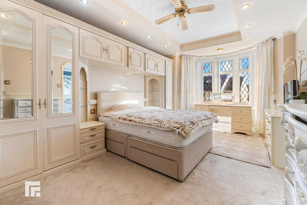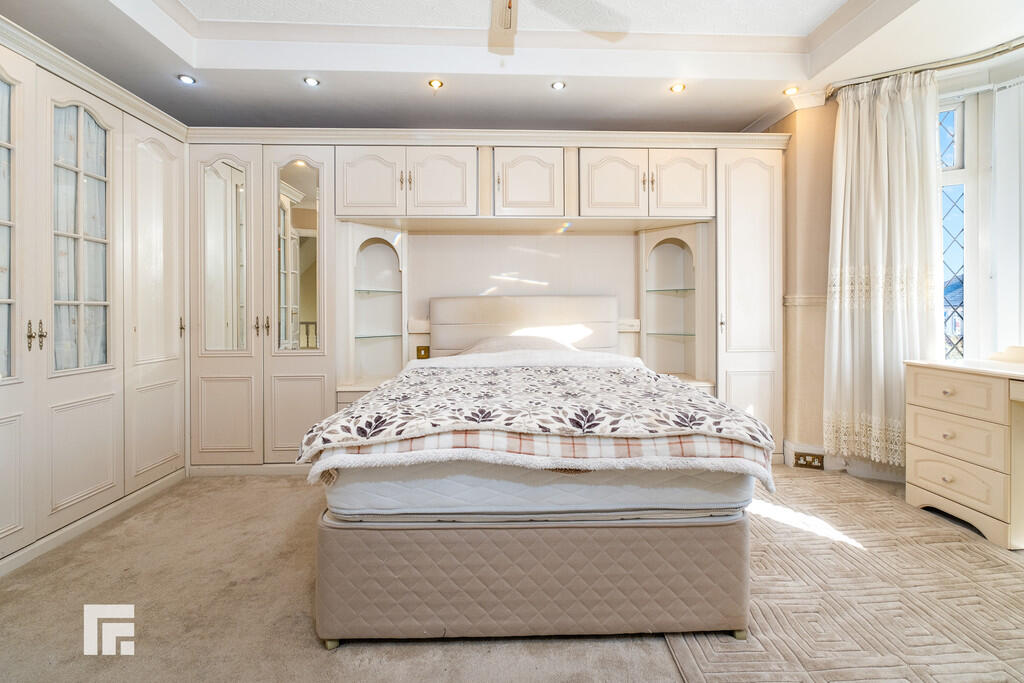 MASTERBEDROOM14' 8" x 12' 7" (4.48m x 3.85m) Double glazed bay window to front aspect. Double bedroom. Carpeted flooring. Pendant light fitting and spotlights. Built in wardrobes across two walls. Radiator. Door to: