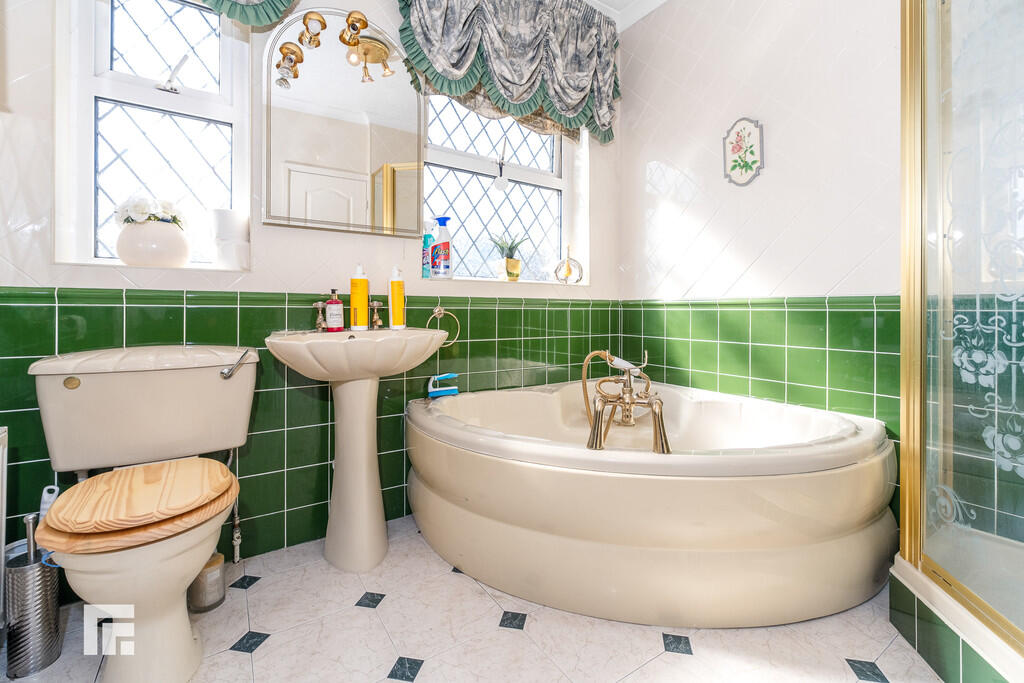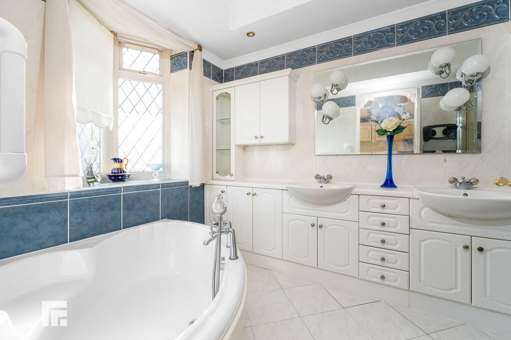 ENSUITE11' 6" x 6' 11" (3.53m x 2.11m) Double glazed window to front aspect. Fully tiled walls and flooring. Panelled corner bath with hot and cold tap over, with handheld attachment above. Wall mounted vanity with two inset wash hand basins with mixer tap over with fitted cupboards above and below. Corner shower cubicle with mains shower. Wall mounted mirror over with fixed side lighting. WC. Spotlights. Extractor fan. Built in storage.