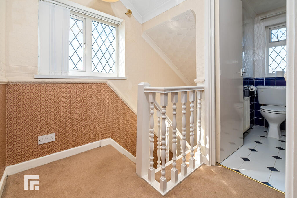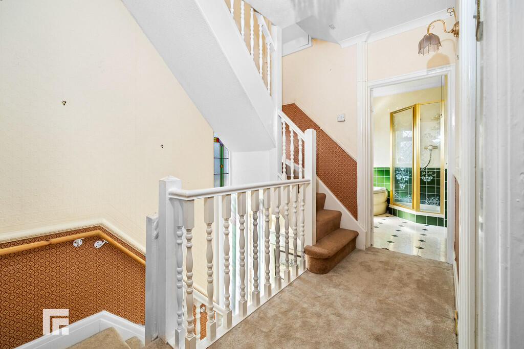 FIRSTFLOORLANDING Split level landing. Carpeted flooring. Pendant lighting. Original large obscure feature window to side aspect. Doors to two bedrooms and bathroom.