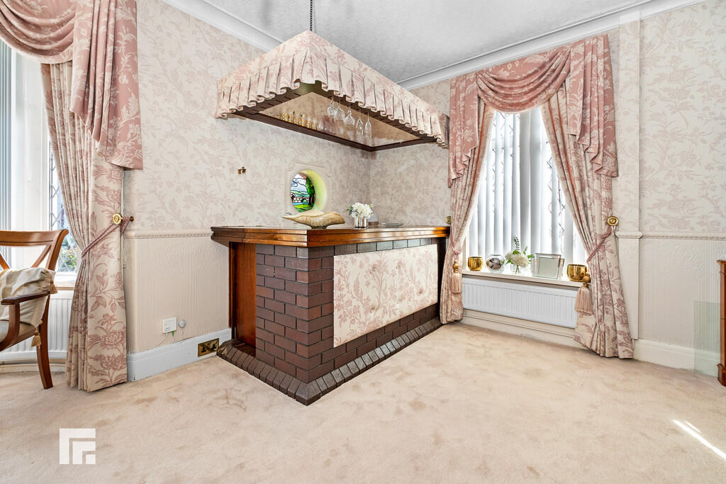 LOUNGE19' 6" x 11' 3" (5.96m x 3.43m) Double glazed bay window to front with additional window to side. Carpeted flooring. Pendant lights to ceiling. Two alcoves with built in storage. Inset gas fire with mantle surround. Brick built bar area. Dado rail and coving to ceiling. TV and Telephone point. Radiator.