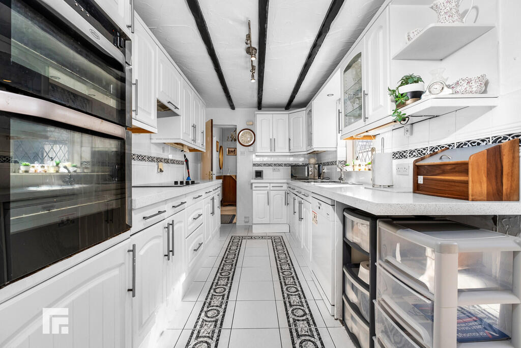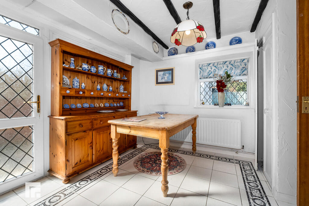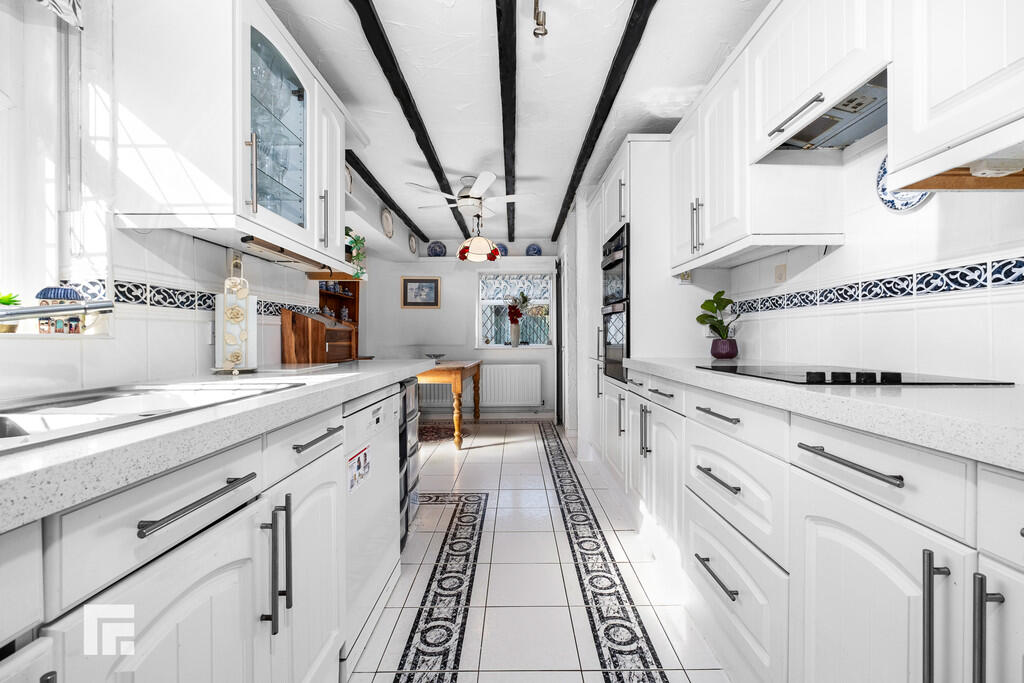 KITCHEN20' 9" x 11' 4" (6.33m x 3.46m) Range of wall, base and drawer units with worktops over incorporating inset stainless steel double sink with drainer and mixer tap over. Integrated grill and oven. Space for appliances such as fridge/freezer, washing machine and dishwasher. Four ring electric hob, with extractor over. Double glazed windows to side and rear aspect. Patio door leading to rear garden. Pendant lighting and beams to ceiling. Radiator.