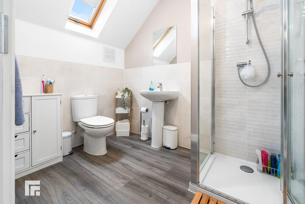 ENSUITE Large modern en-suite. Laminate flooring. Partially tiled walls. Velux window to rear aspect. Pendant light fitting. WC. Pedestal wash hand basin with mixer tap over. Walk in shower cubicle with mains powered shower over. Chrome heated towel rail.