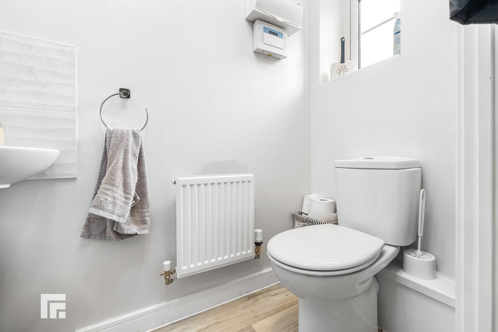 DOWNSTAIRSWC Continuation of laminate flooring. Radiator. Pendant light fitting. WC. Pedestal wash hand basin with mixer tap over and tiled splashback behind. Double glazed uPVC window to front aspect. Extractor fan.