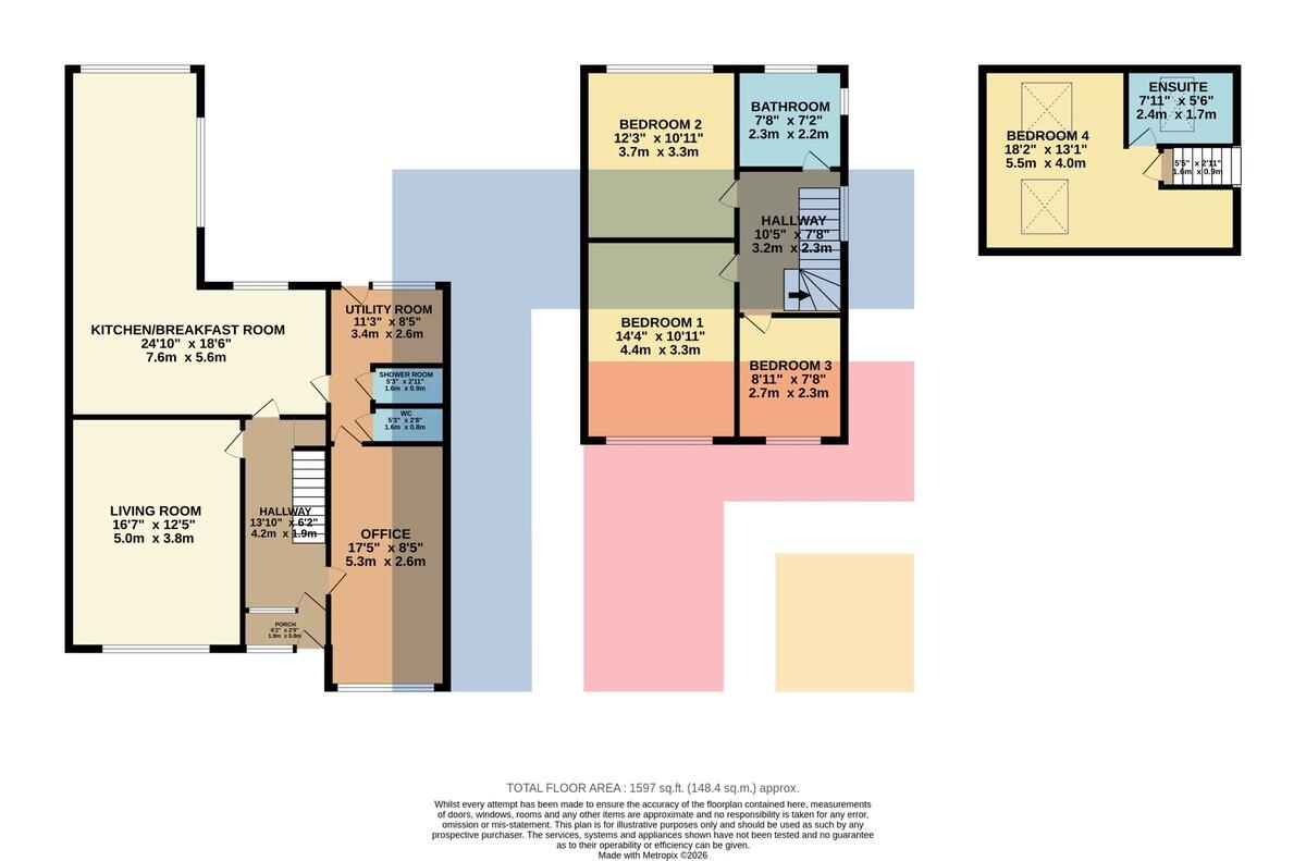 RECEPTIONROOM/BEDROOMFIVE17' 4" x 8' 5" (5.28m x 2.57m) Versatile room which has been utilised as a reception room, games room or fifth bedroom. With double glazed window to the front. Radiator. Fitted carpet. Door to: