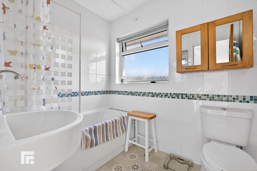BATHROOM With suite to comprise closed cistern w.c, wash hand basin and panelled bath with shower over. Heated towel rail. Ceramic tile walls.