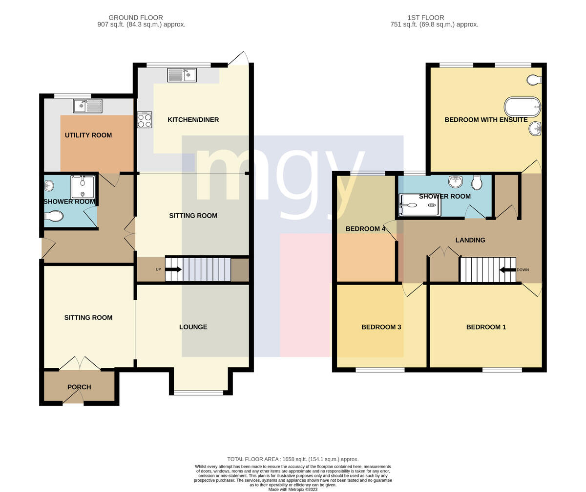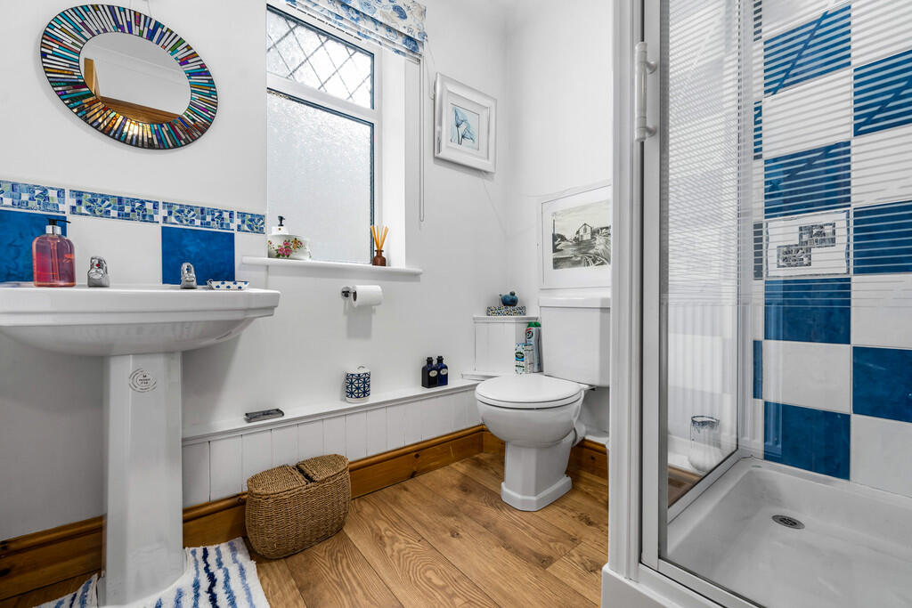 SHOWERROOM6' 1" x 6' 1" (1.87m x 1.87m) The suite comprises low level WC, pedestal wash hand basin and fitted shower cubicle with electric shower over. Laminate wood flooring. Radiator. Tiled splash backs. uPVC double glazed window to side. Extractor fan.