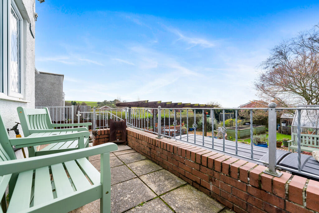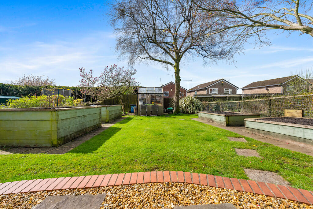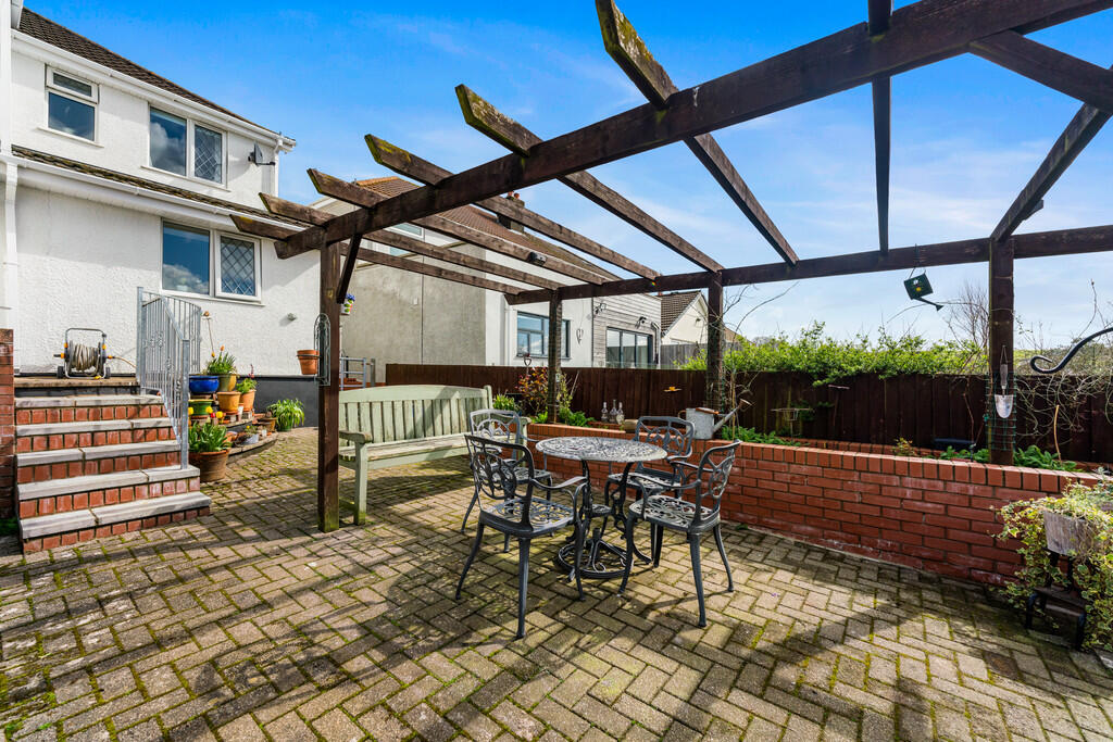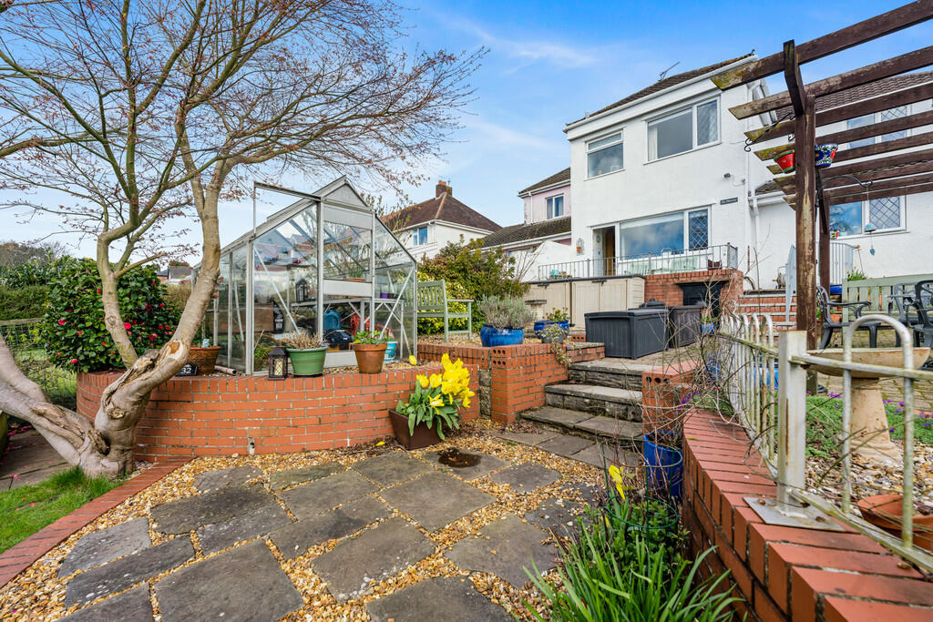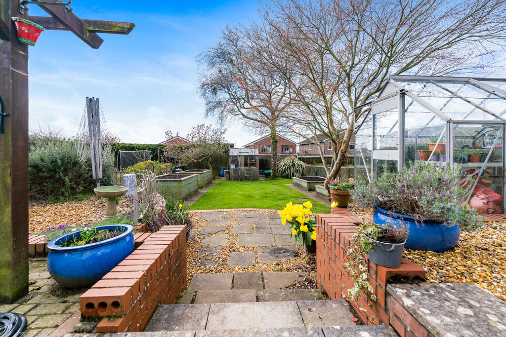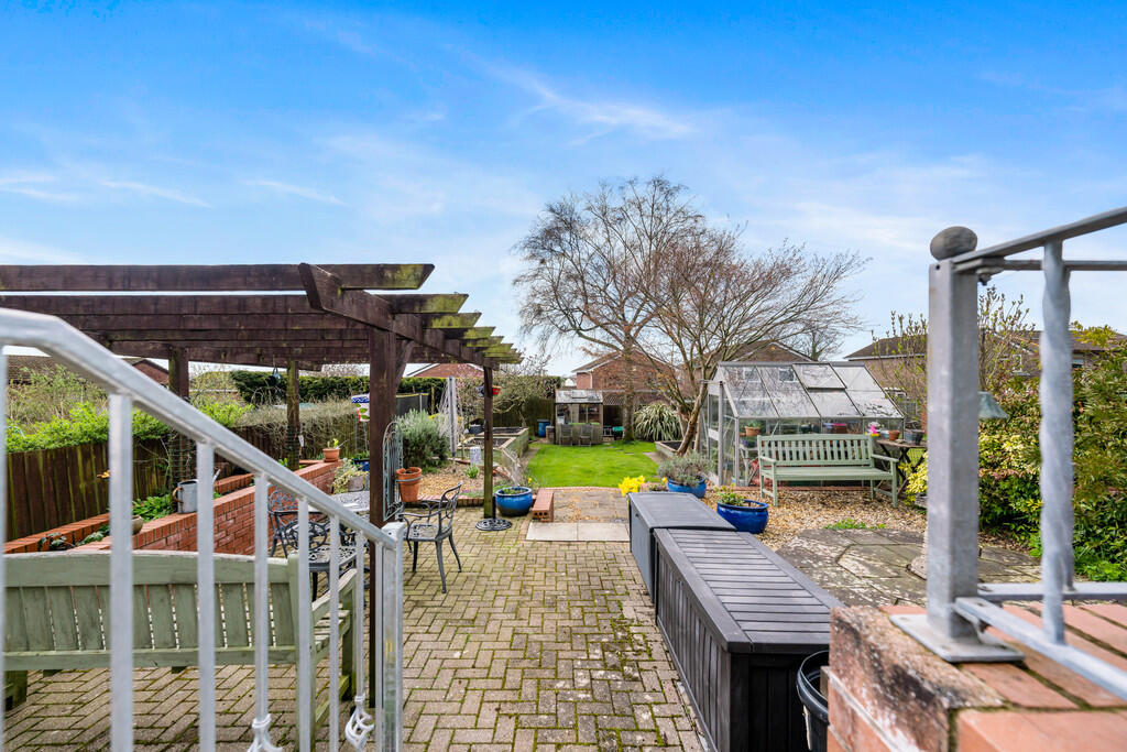 OUTSIDE-REARGARDEN A delightful, South facing, landscaped rear garden made up of spacious lawn, paved patio areas and raised flower beds. Feature pergola. Potting shed. Greenhouse. Boundary fence. Outside tap. External power point