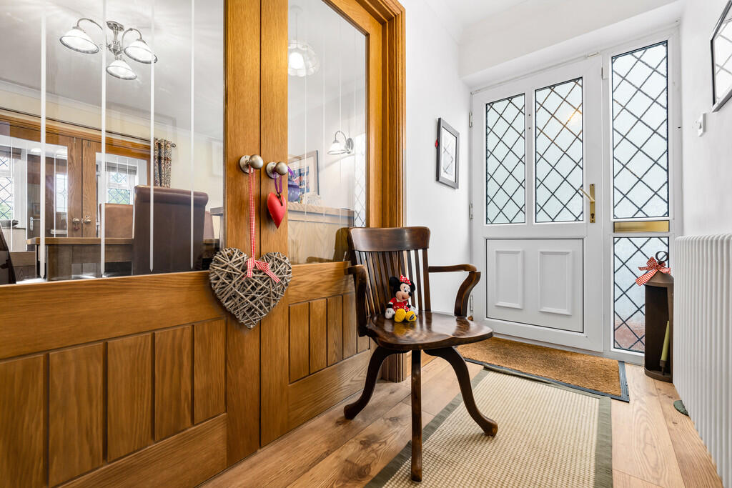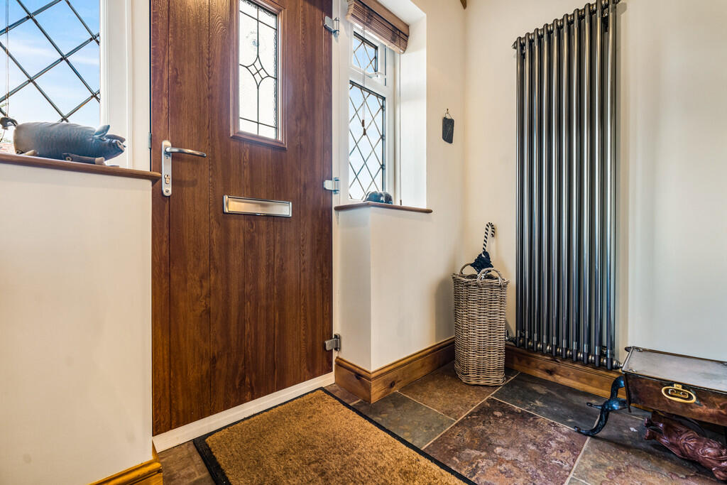 PORCH8' 5" x 3' 6" (2.58m x 1.07m) A beautiful entrance porch entered via composite door with double glazed inset and matching side windows. Feature pitched roof and beamed ceiling. Tiled flooring. Column radiator. Glazed oak double doors into to reception/dining room.