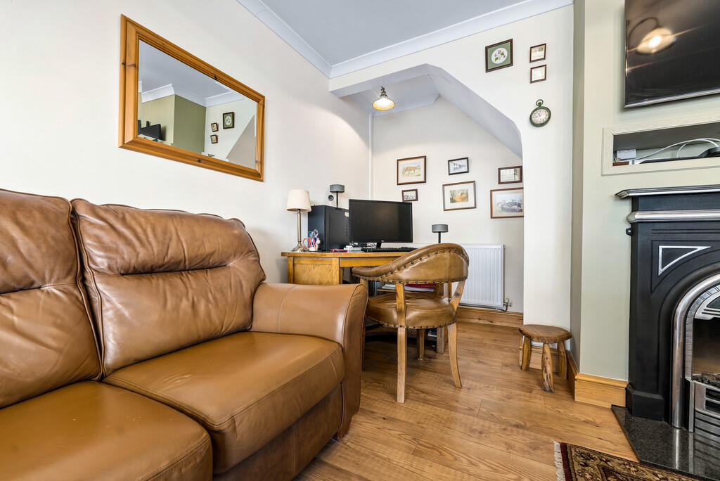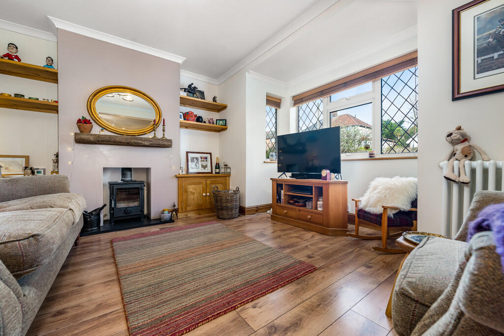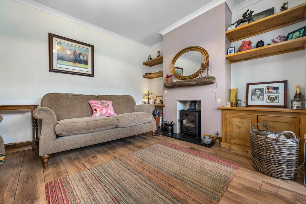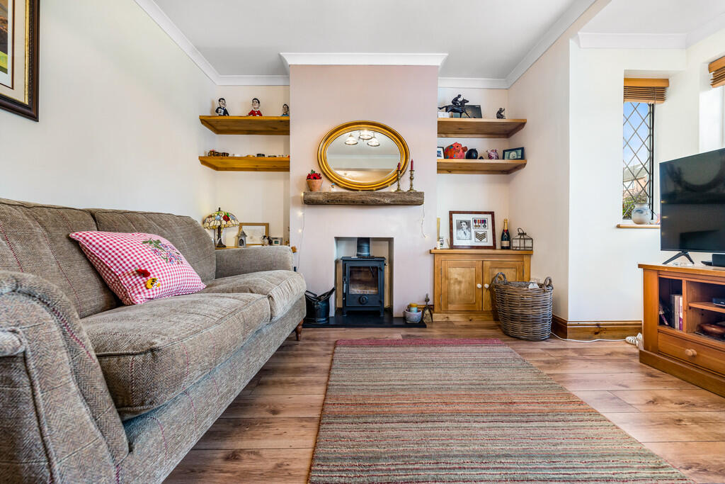 LOUNGE13' 3" x 12' 7" (4.06m x 3.85m) uPVC double glazed bay window to front. Feature wood burner with slate hearth. Laminate wood flooring. Radiator.