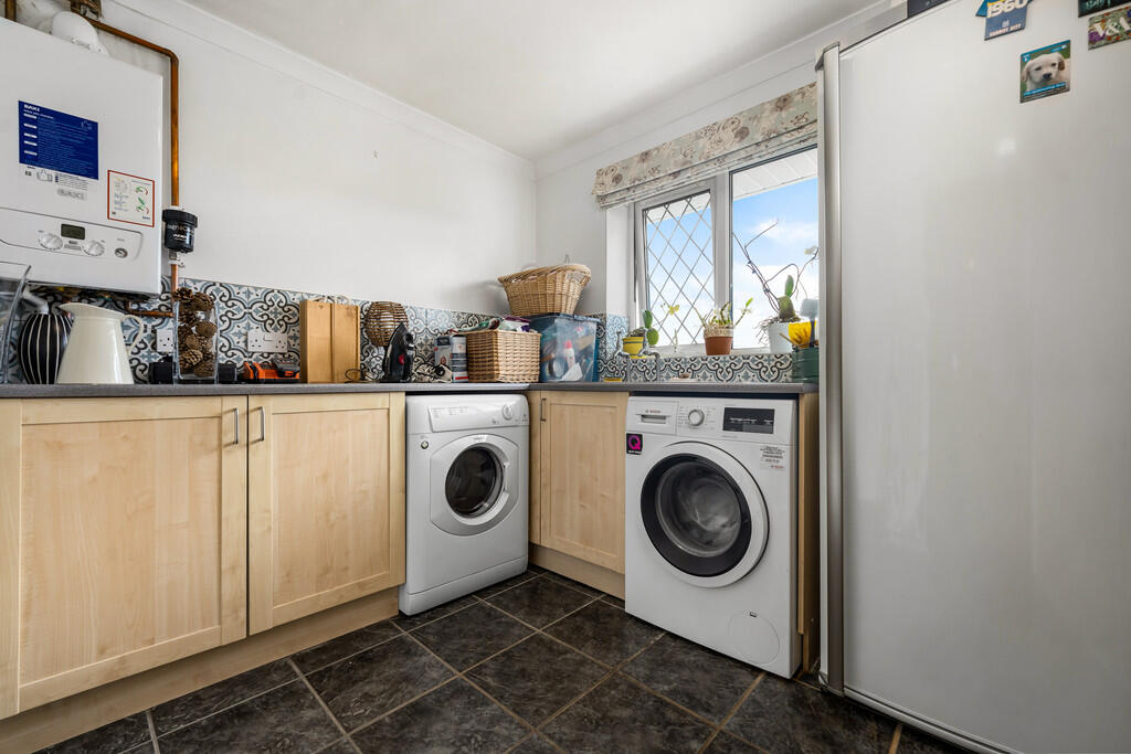UTILITYROOM8' 7" x 7' 4" (2.63m x 2.24m) Fitted base units with complementary work surfaces. Space for washing machine, tumble dryer and fridge/freezer. Wall mounted gas central heating boiler. Tiled flooring and splash backs. Fitted storage cupboard with sliding door. uPVC double glazed window to rear with views. Radiator.