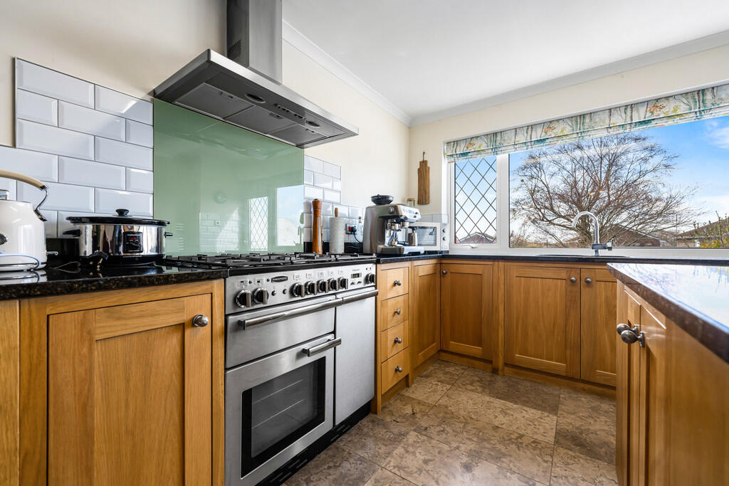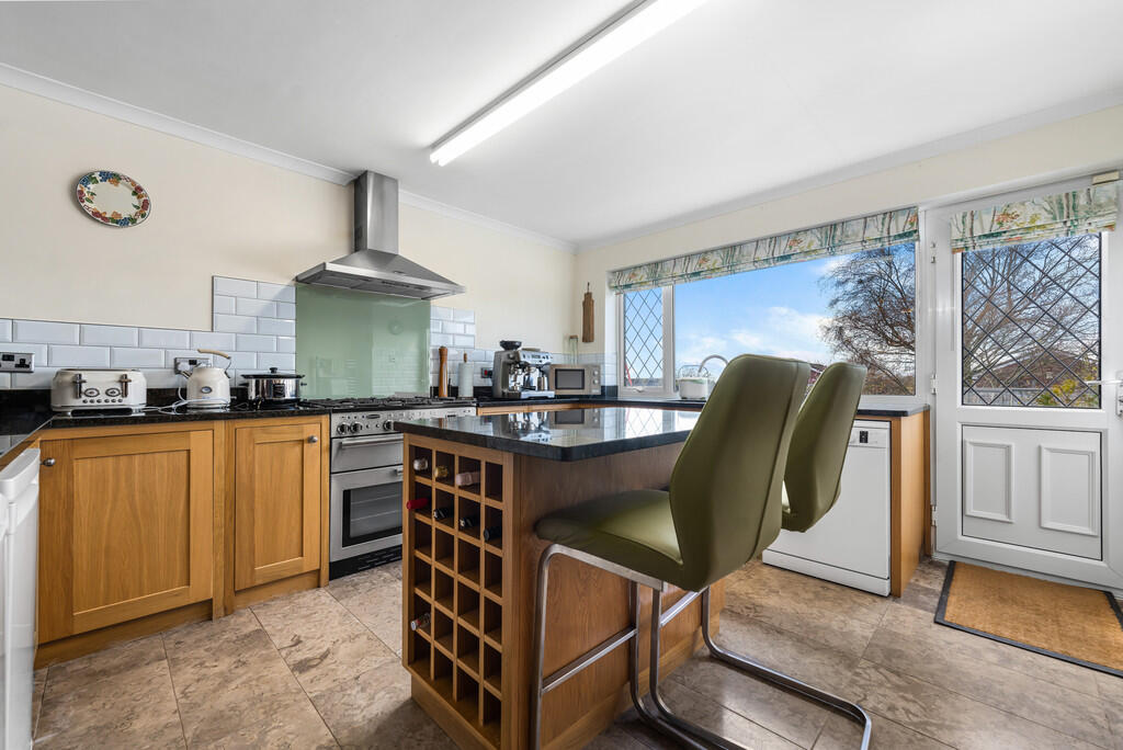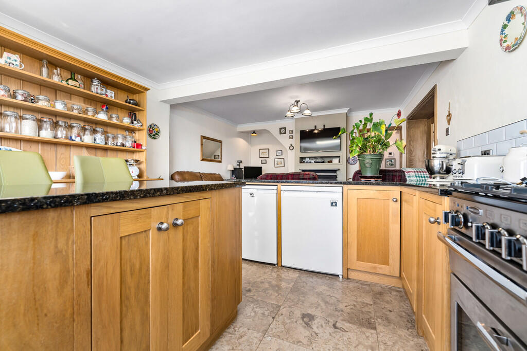 KITCHEN/FAMILYROOM25' 4" x 13' 3" (7.73m x 4.05m) A beautiful, hand-made, solid oak wood kitchen which includes a range of base units and central island/breakfast bar with complementary granite work surfaces. Rangemaster gas cooker. Space for dishwasher, fridge and freezer. Limestone tiled flooring and ceramic tiled splash backs. Ladder radiator. uPVC double glazed window and external door to rear