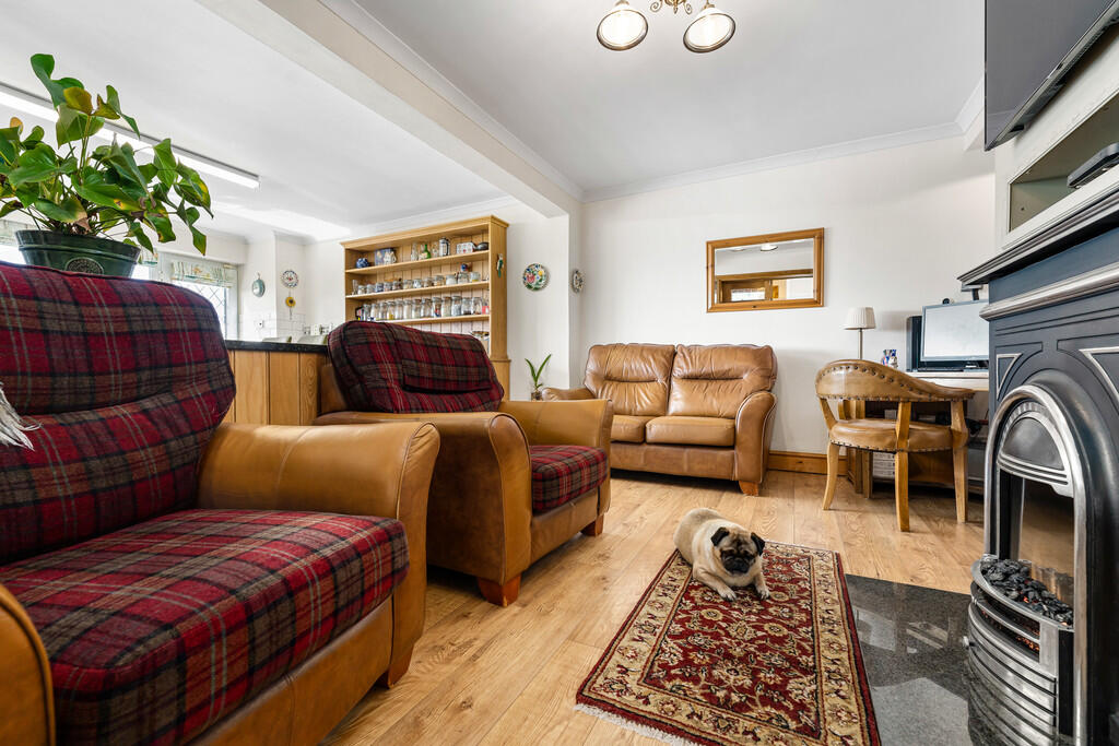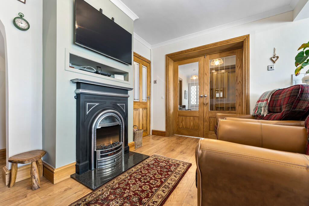 With superb views. The family area includes feature electric fireplace, laminate wood flooring, radiator and glazed double doors to inner hallway.