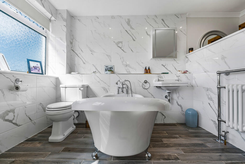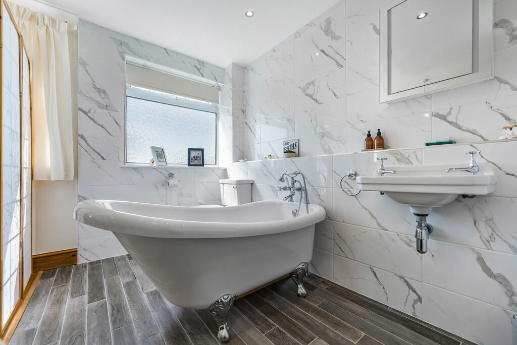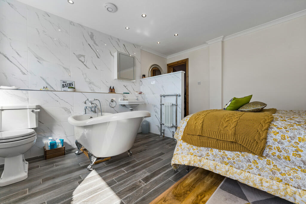 BEDROOMTWO12' 7" x 12' 6" (3.84m x 3.83m) An impressive double bedroom open to the en-suite. Two uPVC double glazed windows windows to rear with stunning views. Radiator. Bathroom suite comprises low level WC, wash hand basin and roll top, freestanding bath with shower attachment. Radiator. Tiled flooring and splash backs. Spotlights. Extractor fan.