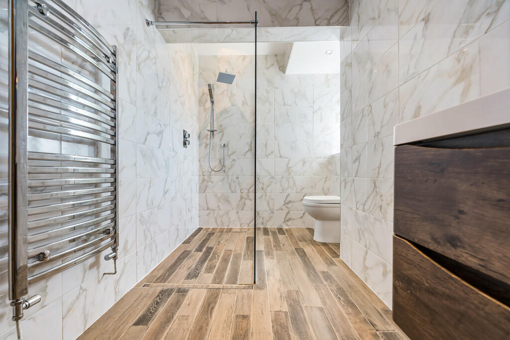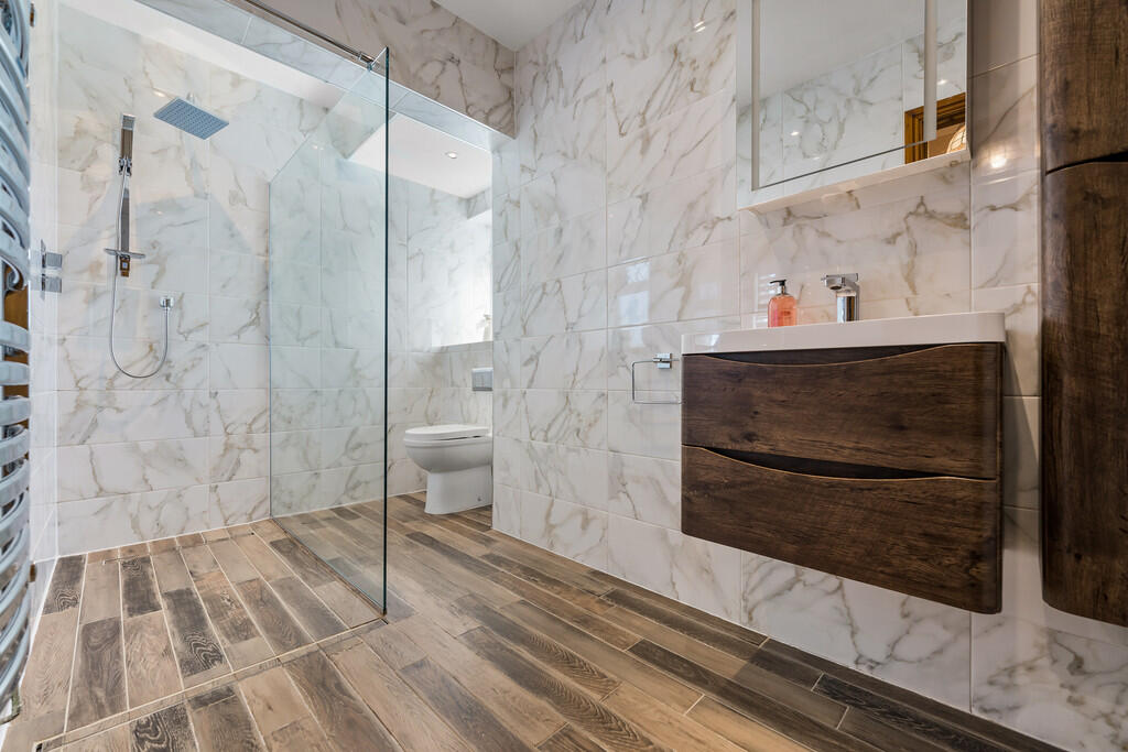 SHOWERROOM/WETROOM11' 0" x 4' 10" (3.36m x 1.49m) A luxury suite which includes low level WC, floating vanity enclosed wash hand basin and walk in shower with rain shower head and separate attachment. Fully tiled walls and flooring with under floor heating. Ladder radiator. Spotlights. Extractor fan. uPVC double glazed window to rear.