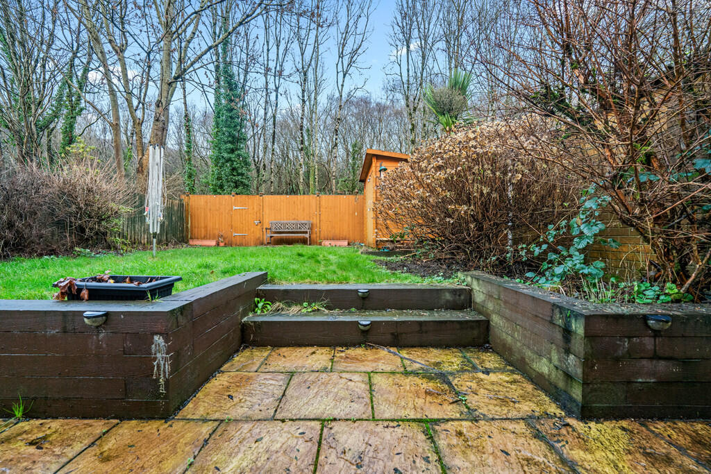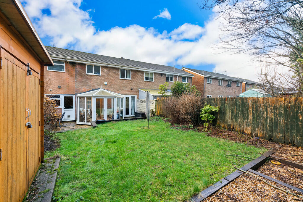 REARGARDEN Paved patio leading onto an area of lawn. Enclosed by timber fencing with timber gate to rear. Timber storage shed. Outside tap.