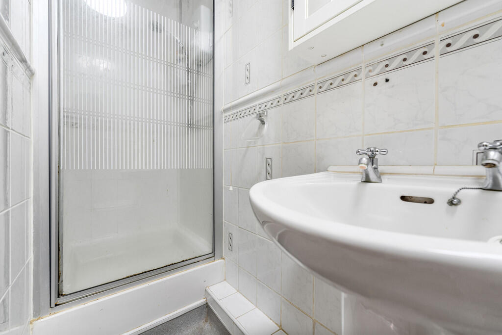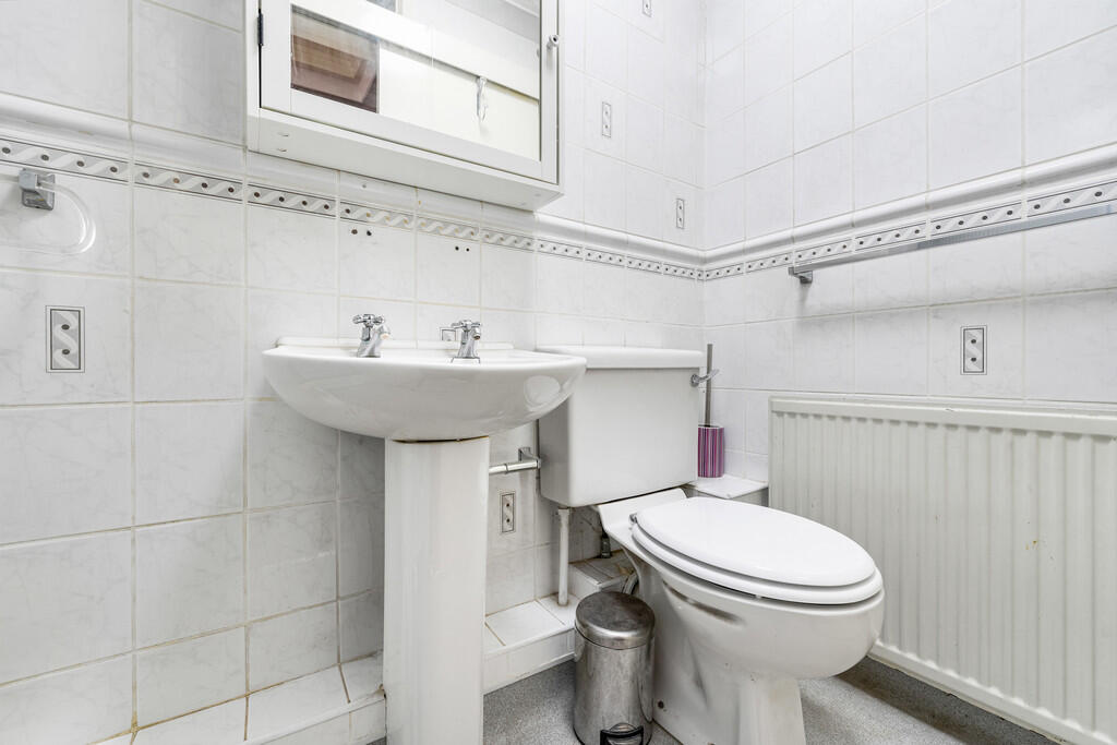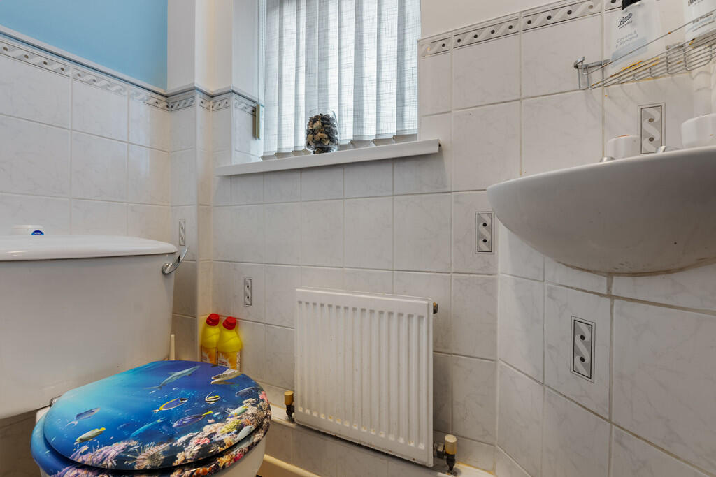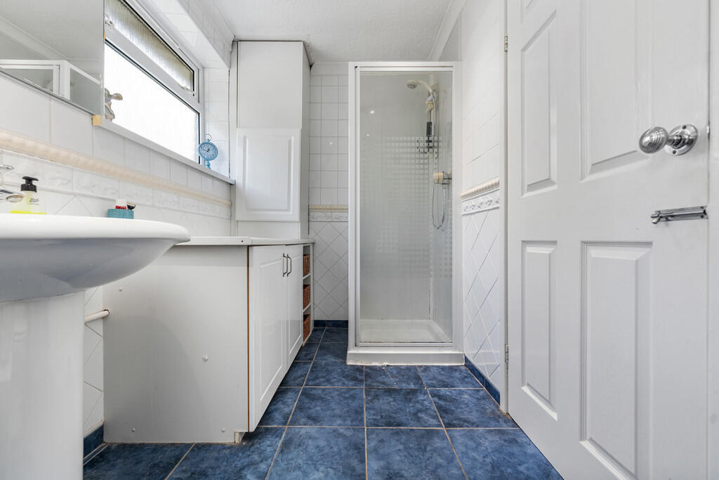 SHOWERROOM Comprising low level wc, wash hand basin and shower cubicle. Full wall tiling. Radiator.
