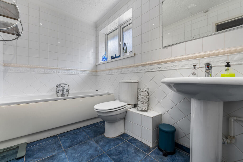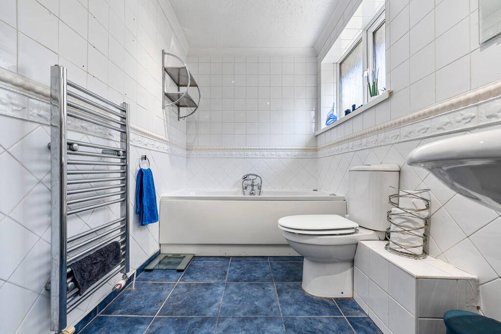 Level storage cupboards. Concealed Worcester gas central heating boiler. Tiled flooring. Full wall tiling. Two obscured glass windows to rear. Chrome heated towel rail.