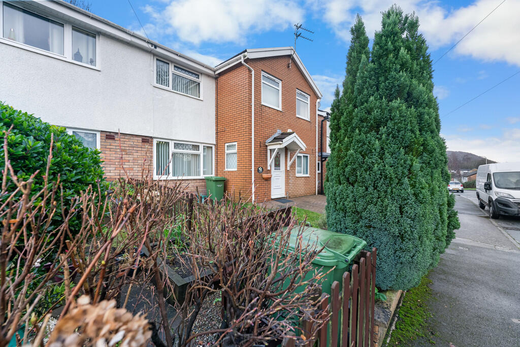 FRONTGARDEN With key block paved driveway and area of lawn. Low level brick wall to front with inset conifers.