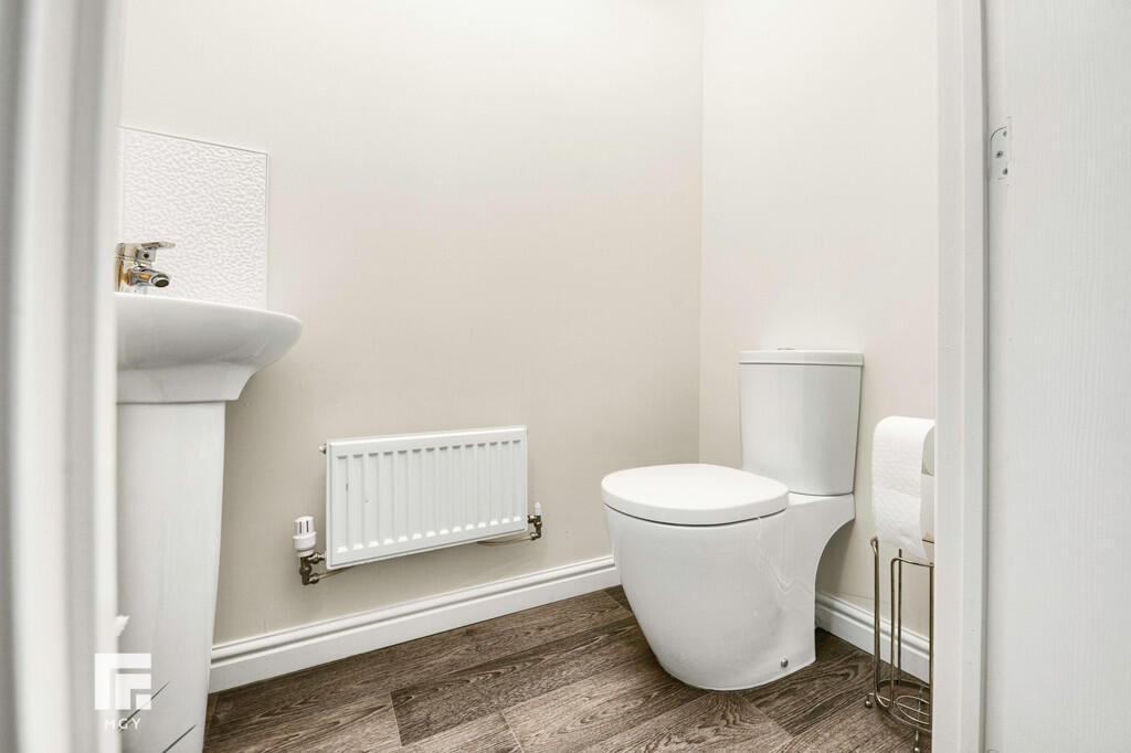 CLOAKROOM5' 6" x 3' 0" (1.68m x 0.93m) Modern white suite; low level WC, corner pedestal wash hand basin with chrome mixer tap and tiled splashback. Extractor fan. Radiator.