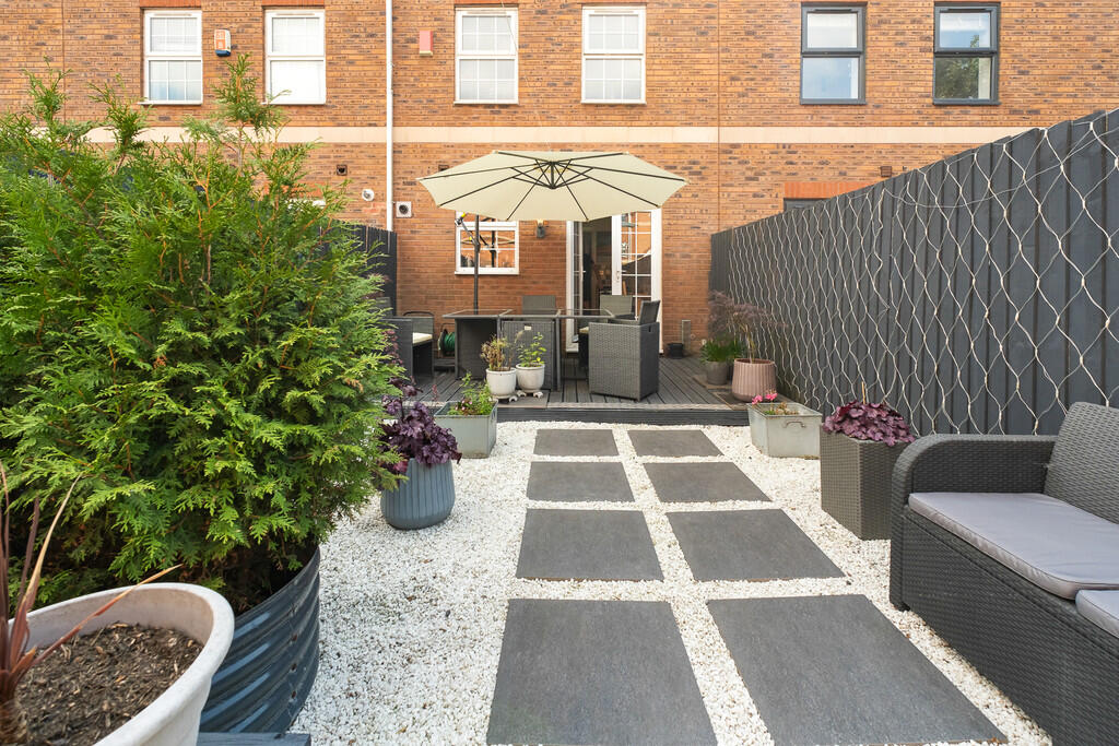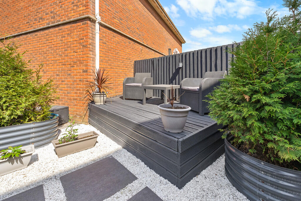 GARDEN Excellent rear garden, with ample sun. Part decked and shingled areas with rear gate access. Outside tap and lighting. Fenced borders. Accessed from the kitchen.