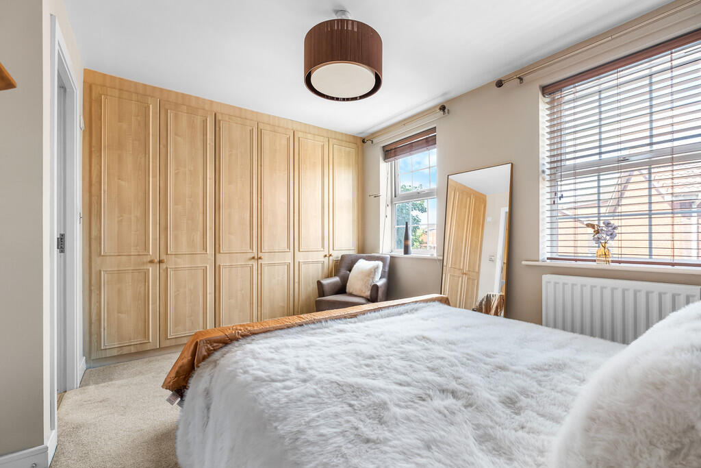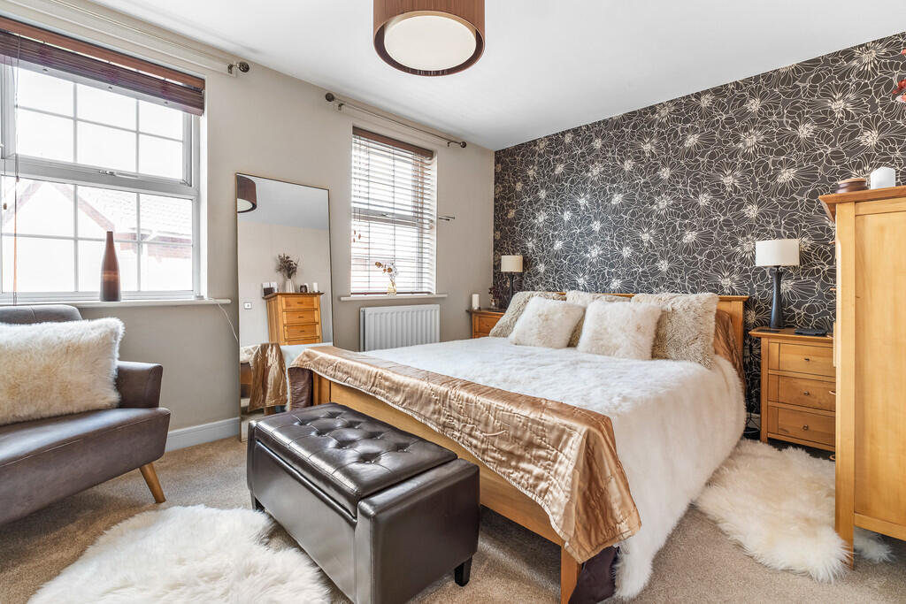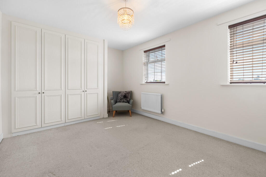 MASTERBEDROOM12' 4" x 10' 0" (3.77m x 3.06m) Two double glazed uPVC windows to rear aspect. Carpeted flooring. Radiator. Fitted wardrobes across one wall. Pendant light fitting. Coving. Door to:-