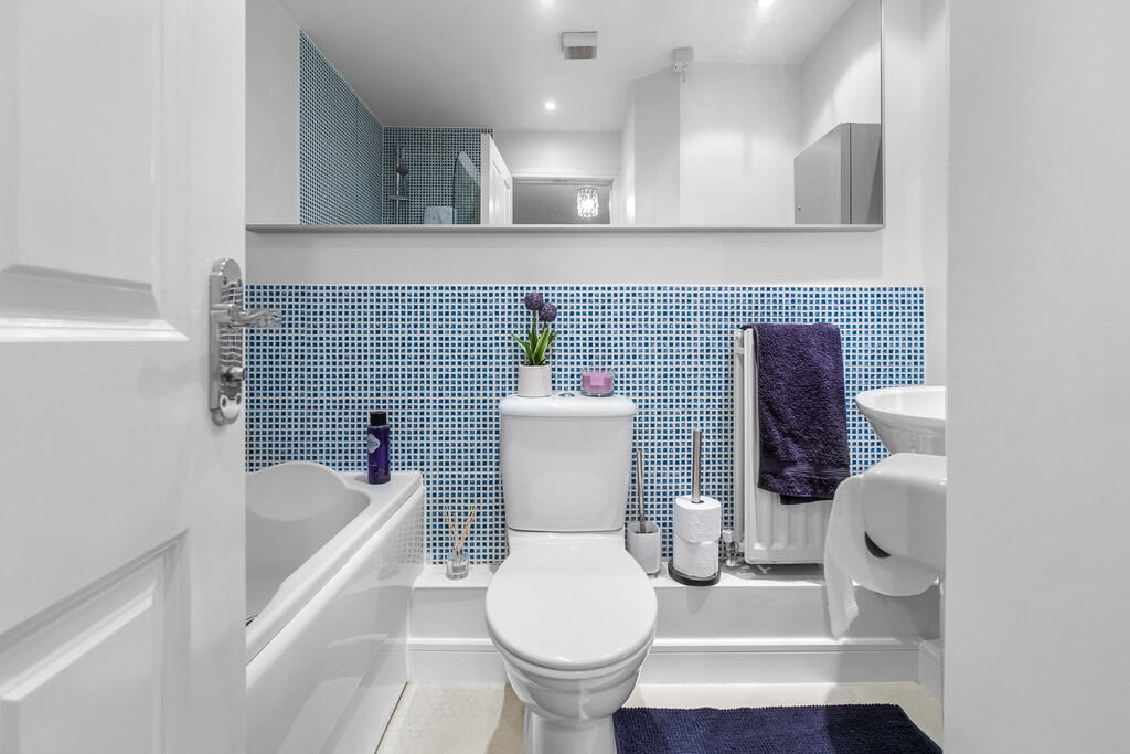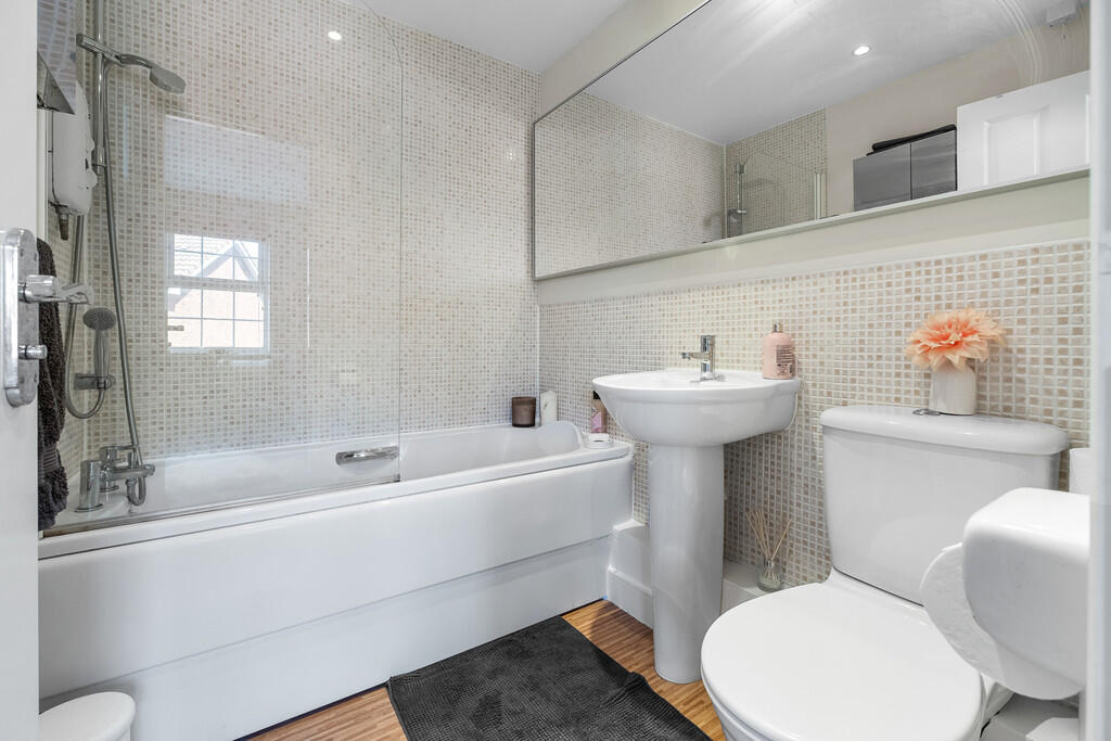 BATHROOM7' 6" x 5' 5" (2.29m x 1.67m) Fitted bathroom. Vinyl flooring. Partly tiled walls. Panelled bath, with electric shower over. Pedestal wash hand basin with mixer tap and wall mounted mirror above. W.C. Radiator. Extractor fan.