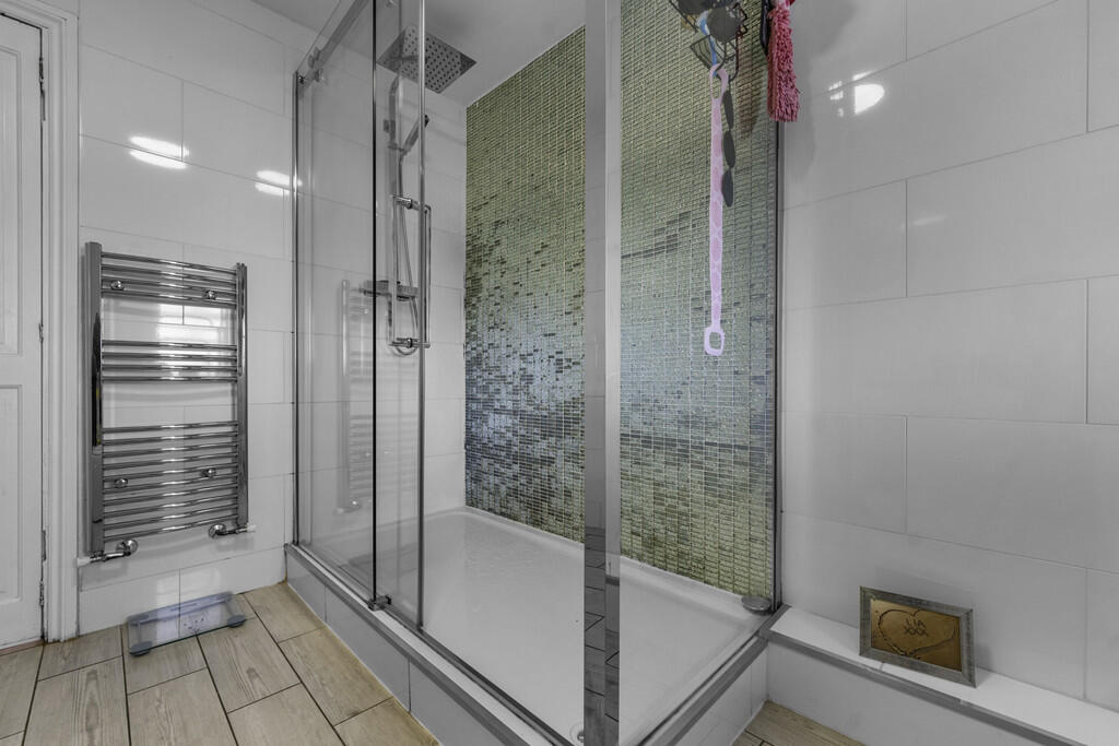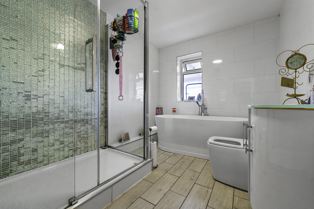 BATHROOM Laminate flooring. Pendant light fitting. Freestanding bath with hot and cold tap over. WC. Vanity wash hand basin with mixer tap over and storage beneath. Tiled walls. Walk in shower cubicle with mains powered shower over. Obscure double glazed window.