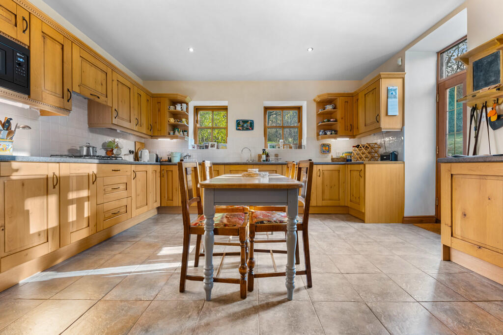 KITCHEN14' 7" x 11' 7" (4.45m x 3.55m) Traditional kitchen with a range of wall, base and drawer units with round edged worktops over incorporating 1.5 sink and drainer with hot and cold tap over, and gas hob with extractor over. Tiled splashbacks. Spotlights. Power points. Integrated appliances such as fridge, freezer, oven, grill, microwave and dishwasher. Two windows overlooking the herb garden. Underfloor heating. Door to rear garden. Step down into breakfast room.